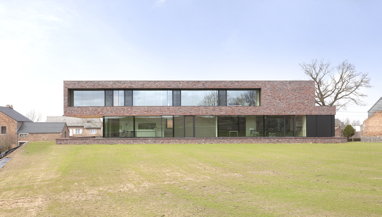 Met 33m kreeg deze woning een ongebruikelijke lengte aangemeten. Die longitude bood meteen potenties om een sterk statement te maken: één van de koppen van de woonst overkraagt 8m. De baksteenarchitectuur krijgt een heel aparte ervaring door het reliëf in de gevelsteen.