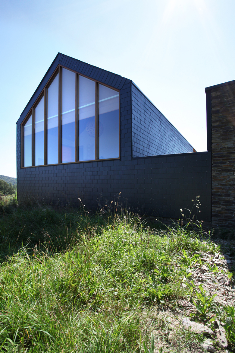 The chosen materials are simple, understated, natural, and contextually driven: slate, wood, and rubble stone. By finishing both the roof and the walls in uniform anthracite-colored slate, the form of the house is accentuated. Wooden exterior joinery adds a warm touch and provides a beautiful contrast with the slate cladding and the rubble-stone masonry.