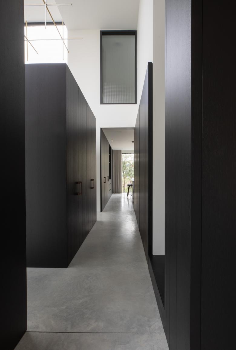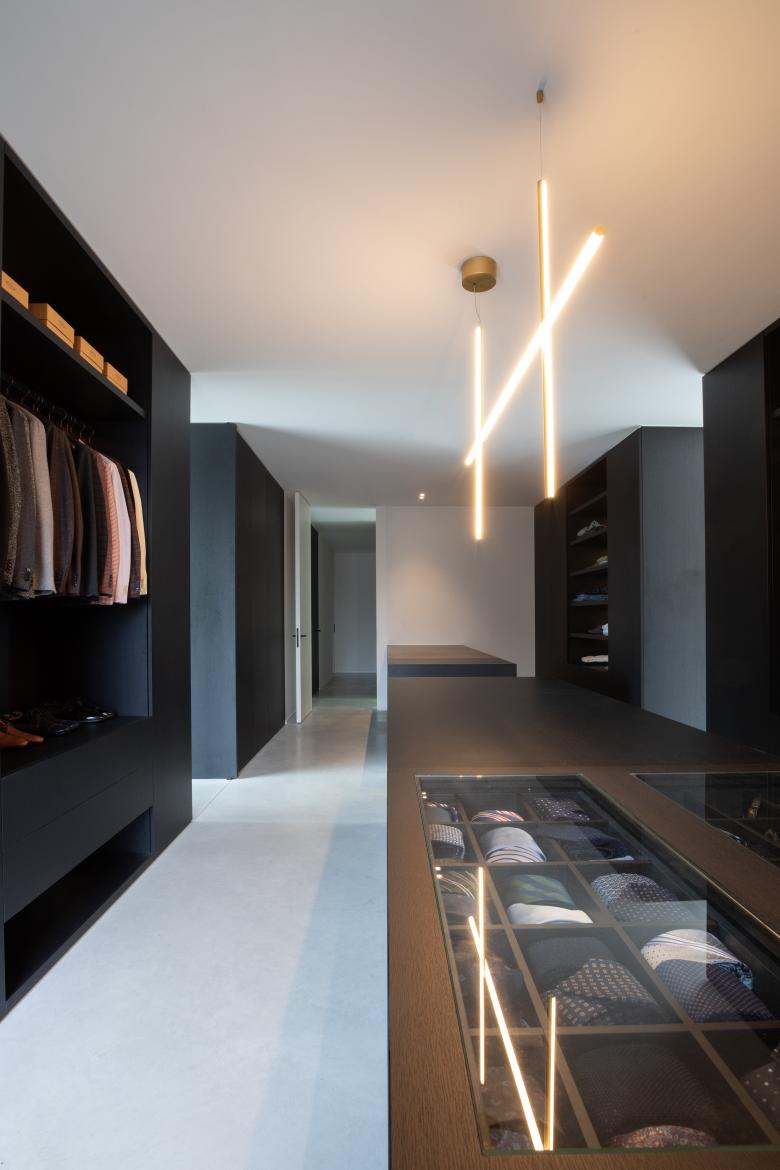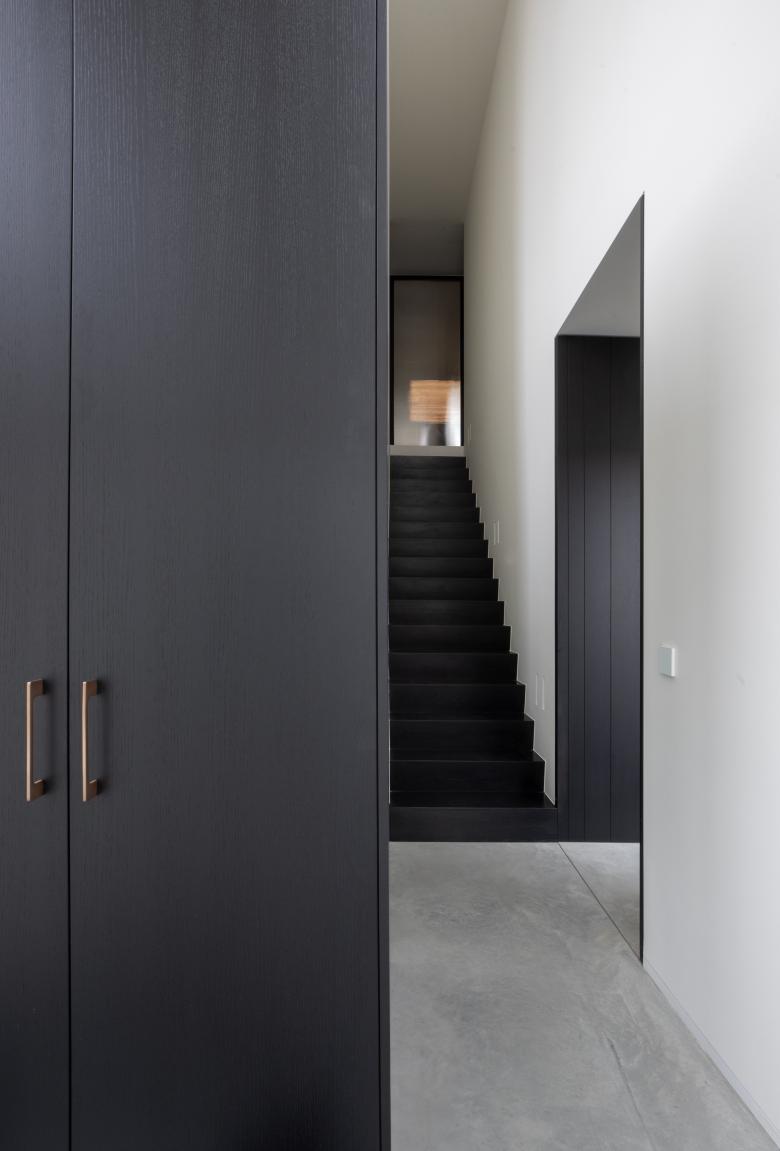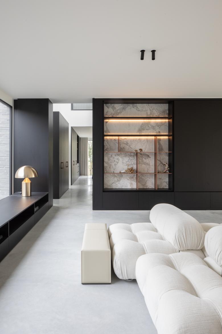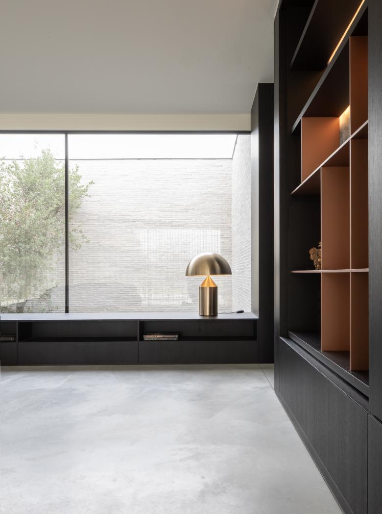 De materialen komen consequent doorheen de woning terug, kijk bijvoorbeeld naar de kastenwand in de zitruimte die overloopt in een verbreed venstertablet aan de patio. Bijzonder aan het maatmeubilair is dat het niet massief is, maar zich als lichte, elementen manifesteert.
