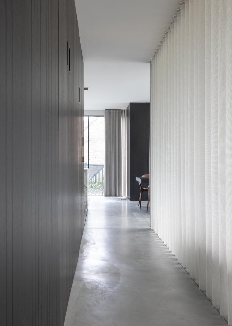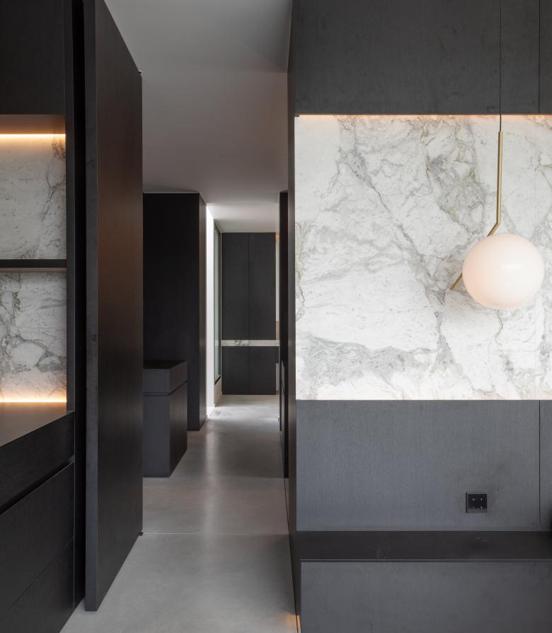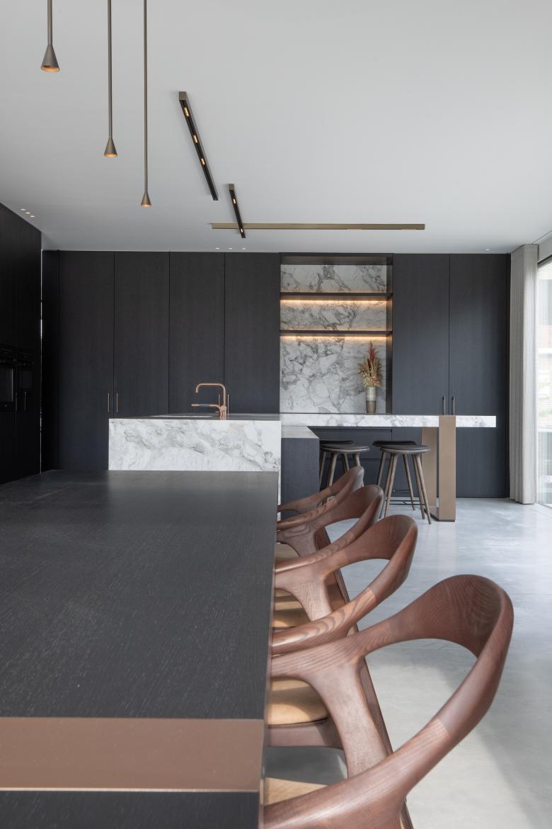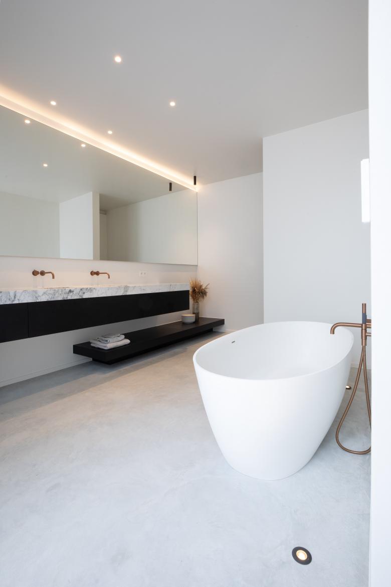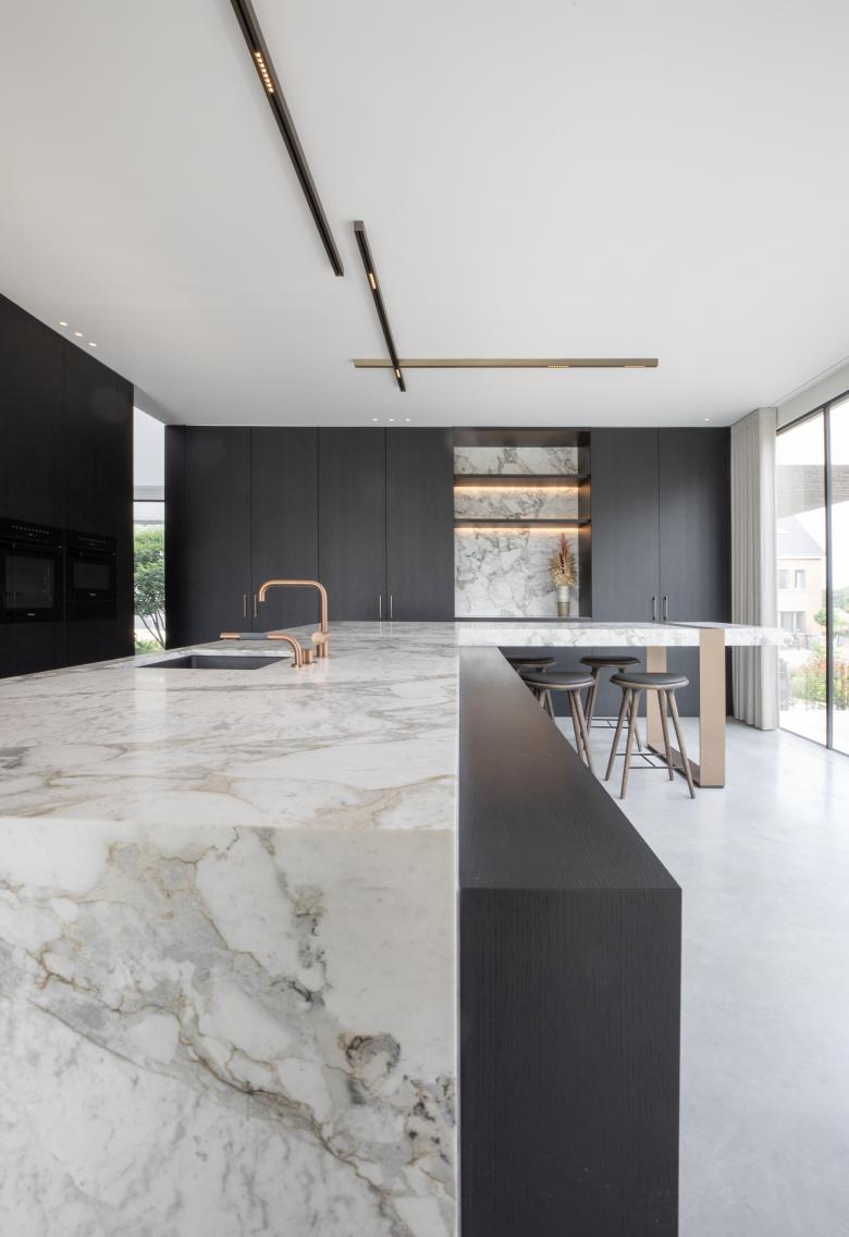 De materialen komen consequent doorheen de woning terug, kijk bijvoorbeeld naar de kastenwand in de zitruimte die overloopt in een verbreed venstertablet aan de patio. Bijzonder aan het maatmeubilair is dat het niet massief is, maar zich als lichte, elementen manifesteert.