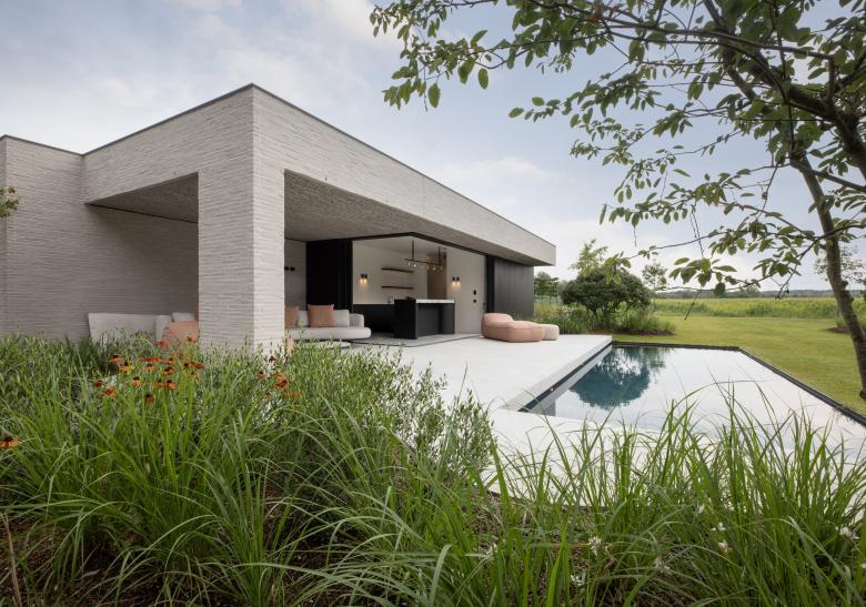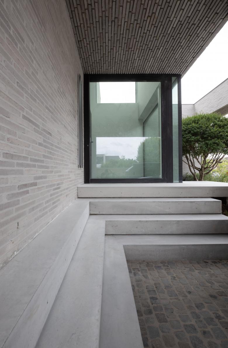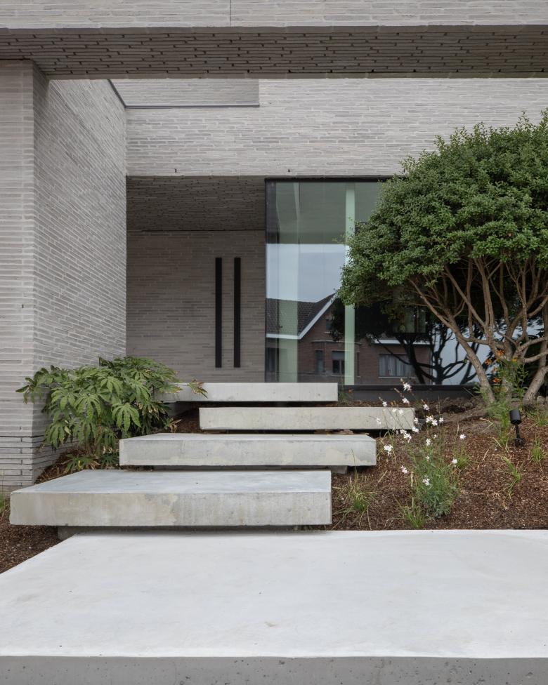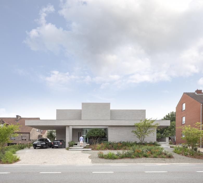 De woning biedt belevingen in een oase van rust, ook al ligt ze langs een drukke steenweg. Een patio, een terugliggende inkomhal zorgen voor een akoestische buffer. Een volume scheidt de zitruimte van de leefkeuken. De zetel is geplaatst zodat in twee richtingen gekeken kan worden: naar de haard of kastenwand met verborgen tv. Grote gevelopeningen bieden maximaal contact met de tuin.