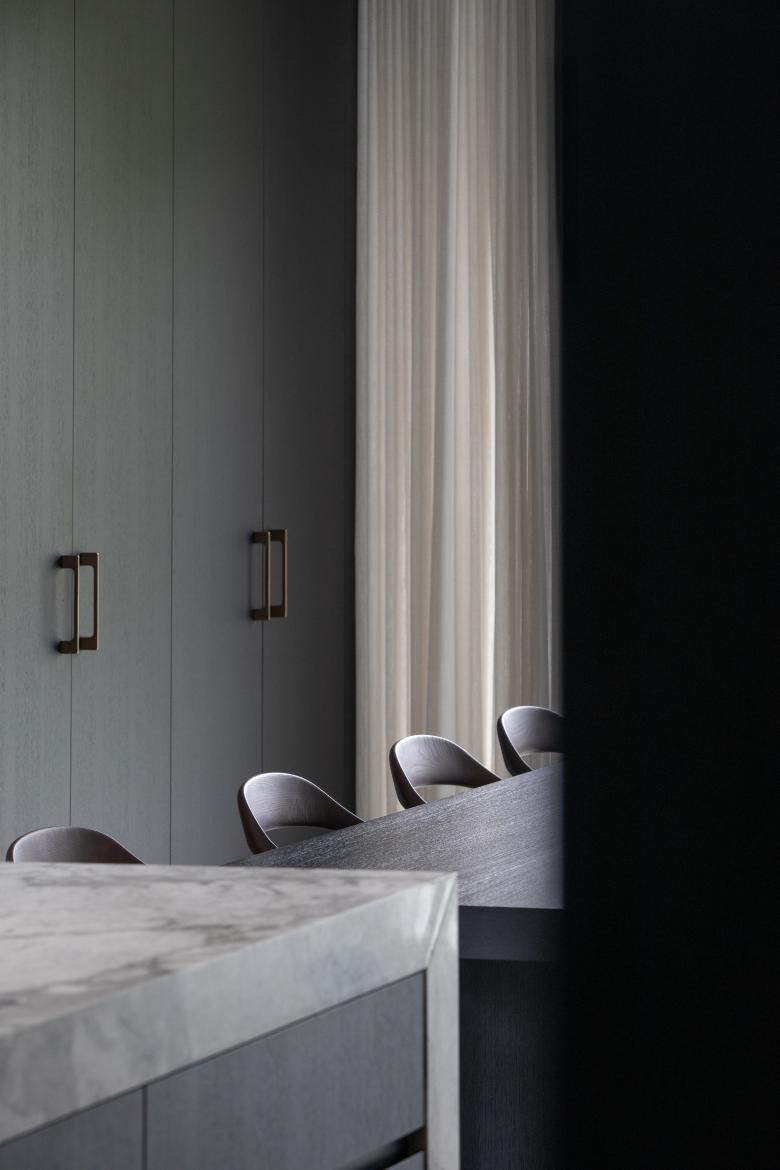 Materials are used consistently throughout the house—for example, the cabinet wall in the living area extends seamlessly into a widened window sill at the patio. A distinctive feature of the custom furniture is its lightness: rather than appearing solid, the elements float delicately within the space.