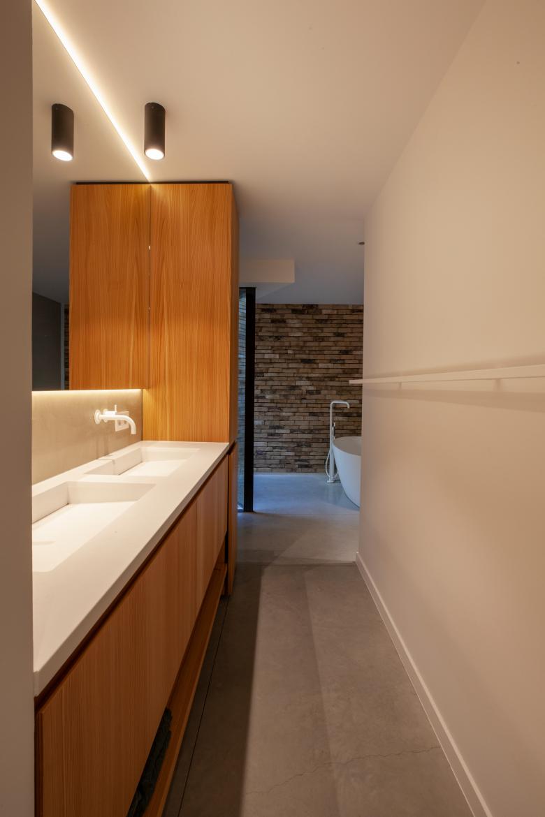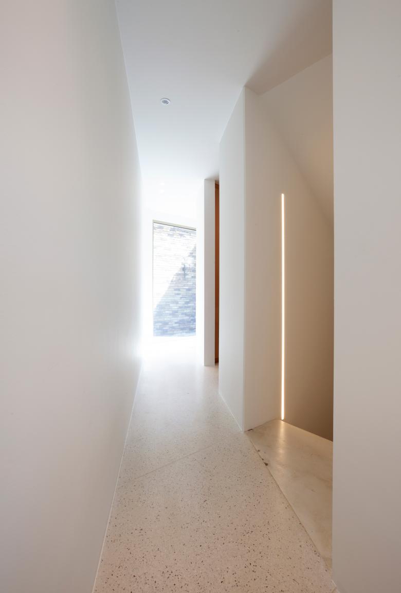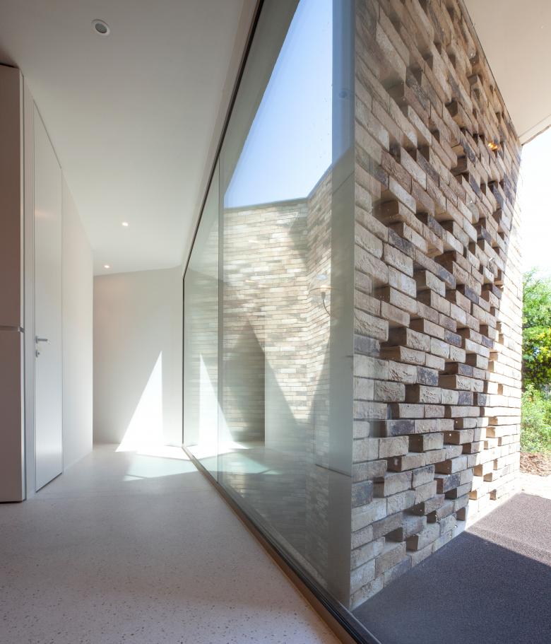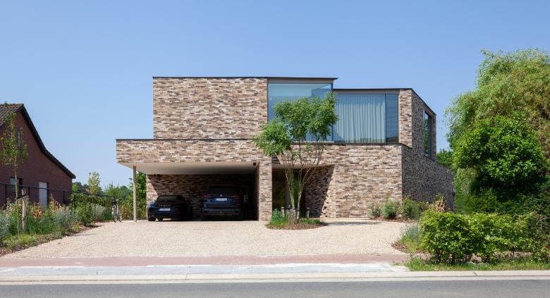 De inplanting van een carport en de inkom in de voorgevel zorgen voor een vertraagd effect in de ontdekkingstocht. De architectuur van de inkomzone herhaalt de trechtergedachte in het begeleiden van bezoekers naar de voordeur. De claustra in deze schuine gevel is niet alleen een eyecatcher, maar brengt ook daglicht naar de kelderverdieping waar de ouders hun nachtvertrekken kregen.