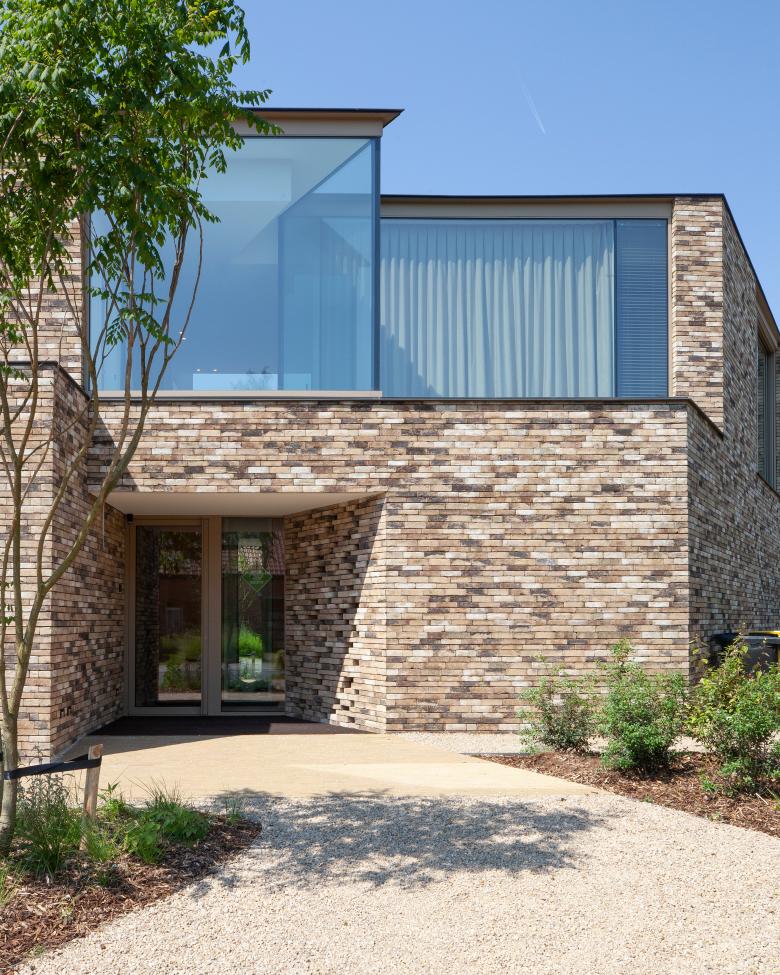 The façade materials achieve cohesion through recurring shades of brown in the masonry and exterior joinery. Glass is minimally framed and cold-bonded to strengthen the connection between inside and outside. A striking feature of the glazing is the window on the upper floor of the front façade, where the glass sharply follows the funnel shape that defines the entrance zone. The glass extends across three floors down to the basement, ensuring a truly distinctive spatial experience.
