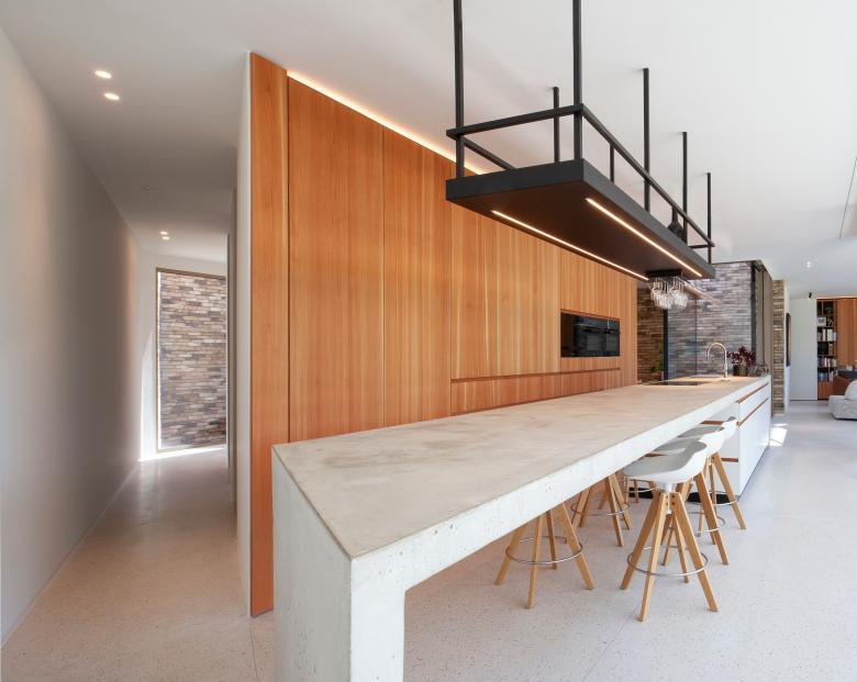 The placement of a carport and entrance on the front façade creates a delayed reveal as visitors approach. The architecture of the entrance zone echoes the funnel concept, guiding guests toward the front door. The claustra in this angled façade is not only an eye-catching feature but also brings natural light down to the basement level, where the parents’ sleeping quarters are located.