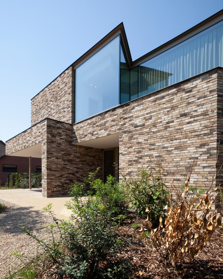 De gevelmaterialen vinden uniformiteit dankzij de terugkerende bruintinten in de gevelsteen en het buitenschrijnwerk. Het glas is maximaal koud verlijmd om de binnen-buiten-relatie te versterken. Een blikvanger in het glaswerk is de raampartij op de verdieping van de voorgevel. Het glas volgt hier in een scherpe hoek de trechtervorm die de inkomzone definieert. Het glasvlak loopt over drie verdiepingen tot op kelderniveau. Een garantie voor een bijzondere beleving.