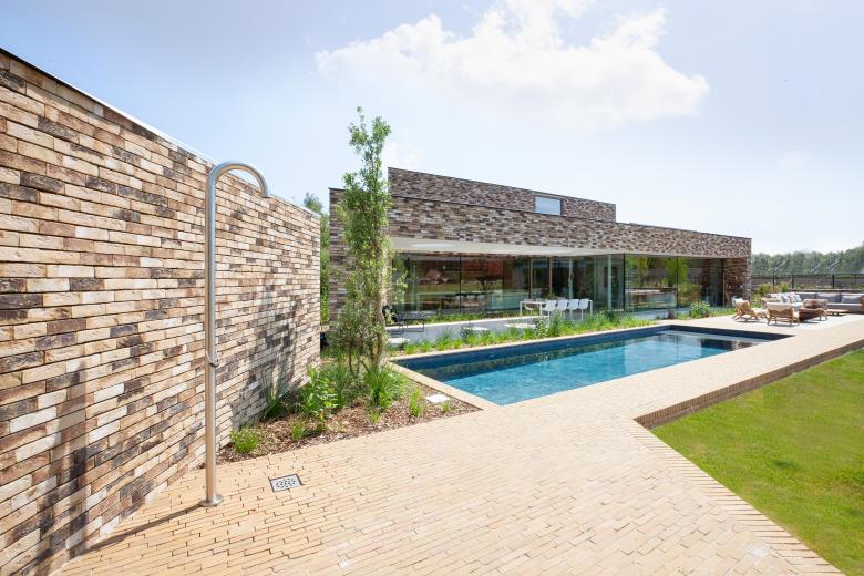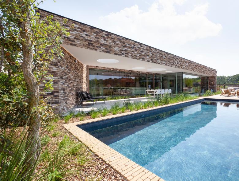 De opvatting van het terras staat garant voor een gevarieerde tuinbeleving. Een overdekte eetruimte krijgt een sterke dynamiek dankzij ronde dakkoepels van verschillende diameters. Het doordringende licht zorgt voor speelse reflecties op de terrasvloer en het zwembad. Naast deze waterpartij biedt een tweede terras een fijne zitruimte in de zon.