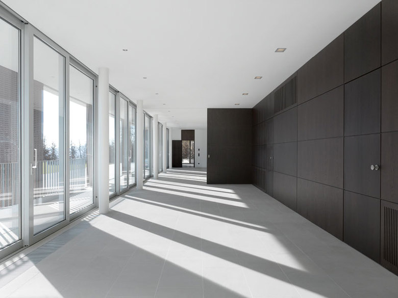 Der schwellenfreie Umgang mit dem Natursteinbodenbelag und die raumhohe Glasfassade mit ihren großzügigen Schiebeelementen in den privaten und repräsentativen Räumen heben die Grenzen zwischen Innen- und Außenraum scheinbar auf. Die Materialwahl ist streng reduziert und beschränkt sich auf eine Kombination von Naturstein (Steigerwald Quarzit), Putz, Stahl und Räuchereiche.