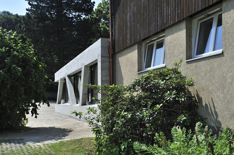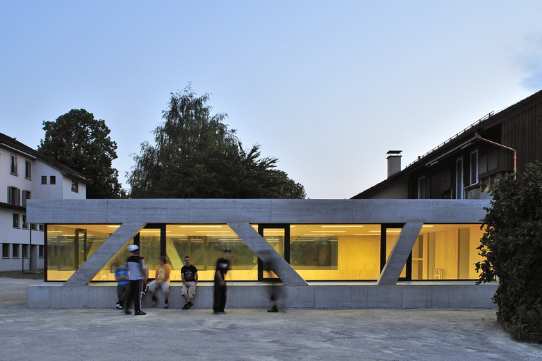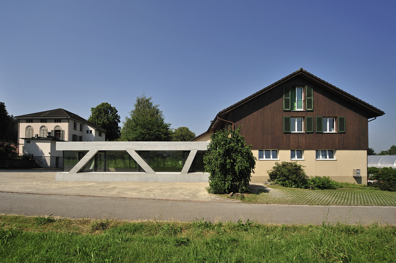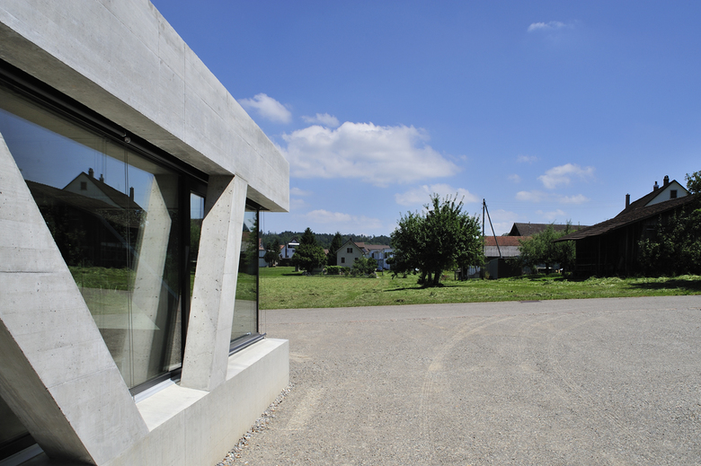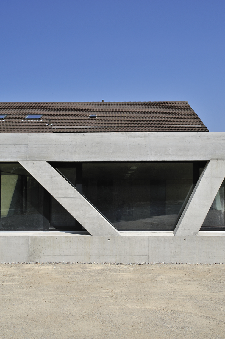Das Gebäude besticht durch das umlaufende Fensterband, nur einige wenige, präzis eingesetzten Betonstützen übernehmen Ablast und Aussteifung der Betondecke. Das statische System , ohne fixen Rastermasse und mit unterschiedlichen Neigungen der Betonstützen ist Teil des architektonischen Konzeptes. Die ganze Bauhülle, Dach eingeschlossen, reduziert sich auf die Materialien Beton und Glas. Der Sichtbeton ist Fassade, Statik, Erdbebensicherheit, Feuchteschutz und robust im Gebrauch. Der Innenausbau mit Dampfsperre, Wärmeisolation, Schallisolierung und einer strapazierfähigen Oberfläche in Holz, die energetisch schnell reagierende Innenhülle. Ganz nach dem bewährten Konzept - harte Schale, weicher Kern.