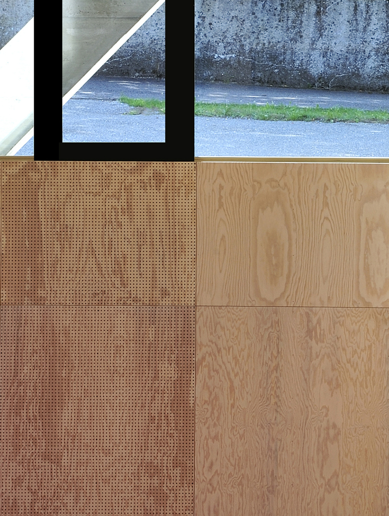 Die Holzverkleidungen innen wurden mit grossformatigen Sperrholzplatten aus französischer Seekiefer ausgeführt. Um eine optimale Raumakustik zu erlangen, sollten rund 85% der Plattenflächen perforiert werden. Die nicht perforierte Fläche von gut 40m2 wurde gestalterisch im Raum verteilt sodass ein Spiel von perforierten und nicht perforierten Platten entstand.