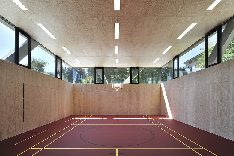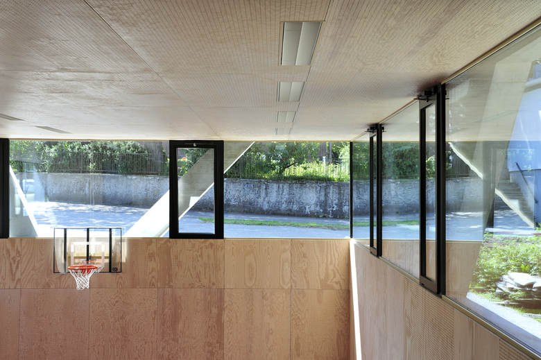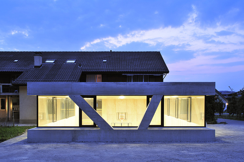 Im Berufsbildungsheim Brüttisellen wohnen 32 dissoziale Jugendliche, die auch ihre Freizeit im Heim verbringen müssen. Das Freizeitangebot wurde mit dem Umbau des Schultraktes durch eine Sporthalle mit 15/10/5m und zwei Fitnessräume erweitert. Infolge Doppelnutzungen bestehender Nebenräume im Altbau wurde das Neubauvolumen an das Hauptgebäude gekoppelt.