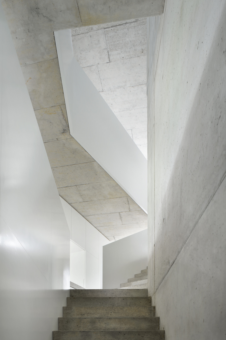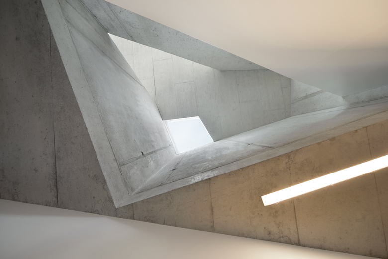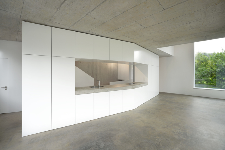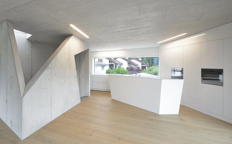 Das Doppelhaus mit seiner unkonventionellen Raumstruktur basiert auf einem Parallelogramm-Grundriss und überzeugt durch eine skulpturale, beschnittene Kubatur. Die unterschiedlich strukturierten und farbigen Putzflächen sowie die kastenförmigen Fenster verleihen dem Gebäude einen verspielten, individuellen Charakter. Vier prägnante Einschnitte gliedern den Baukörper und erfüllen praktische Anforderungen, wie die Zufahrt im Norden und den Durchgang zum gemeinsamen Garten. Innen wurden zwei kontrastierende Wohnkonzepte umgesetzt: Während die talseitige Einheit mit einer geschwungenen Treppe entlang der Trennwand beeindruckt, organisiert sich die Hangwohnung um einen dynamischen Treppenkern. Beide Konzepte verbinden funktionale Erschliessung mit einem spannenden Raumgefühl und bieten den Bewohnern jeweils individuelle Wohn- und Gemeinschaftsbereiche, die optimal auf ihre Bedürfnisse abgestimmt sind.
