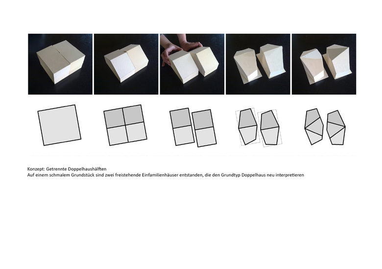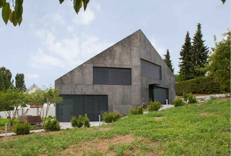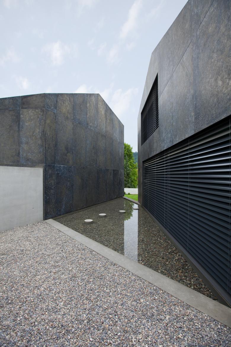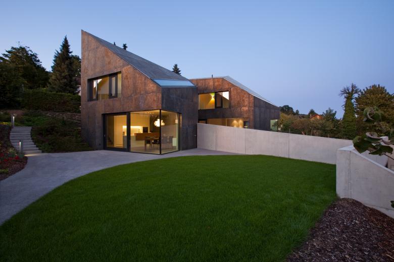 In einer ländlichen Umgebung entstanden zwei freistehende Einfamilienhäuser, die in Volumen und räumlicher Anordnung neue Wege gehen. Der Grundtyp des Doppelhauses wurde skulptural bearbeitet und in polygonale Körper transformiert, die durch Wasserbecken, Spiegelungen und Durchblicke miteinander interagieren und eine besondere Intimität schaffen. Das Erschließungskonzept im Split-Level-Verfahren nutzt den Hangverlauf und prägt die Raumaufteilung, während die Materialwahl – Sichtbeton, feine Putzwände und große Fensterflächen – eine technisch-kühle Ästhetik vermittelt. Die Oberlichter erzeugen sakrale Lichtstimmungen im Innenraum, die dem Gebäude eine besondere Ausstrahlung verleihen. In Zusammenarbeit mit dem Künstler Thomas Sonderegger wurde die Fassade und das Dach aus einzigartig bearbeitetem verzinktem Stahl entwickelt, was dem Gebäude eine monolithische, skulpturale Präsenz verleiht.