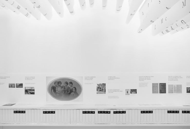 The assembly of the exhibition looks for the most contemporany image where the crowd could capture the atmosphere of how of a change the comunication, culture and knowledge world, that englobes a library, has suffered. The visitor, once immersed into a clear and direct environment, approaches to the contents through the cronologic wall and the thematic clasification of the interactives screens. The exhibition's principal hall is completely white, clean and luminous as Eugeni d'Ors's founding text claimed how the Popular Libraries were meant to be. The Cloud This subtle exhibition aims to build an abstract concept for us. A technological cloud as a metaphor of where the important task of storing and caring for all information, which produces contemporary society, will be developed.