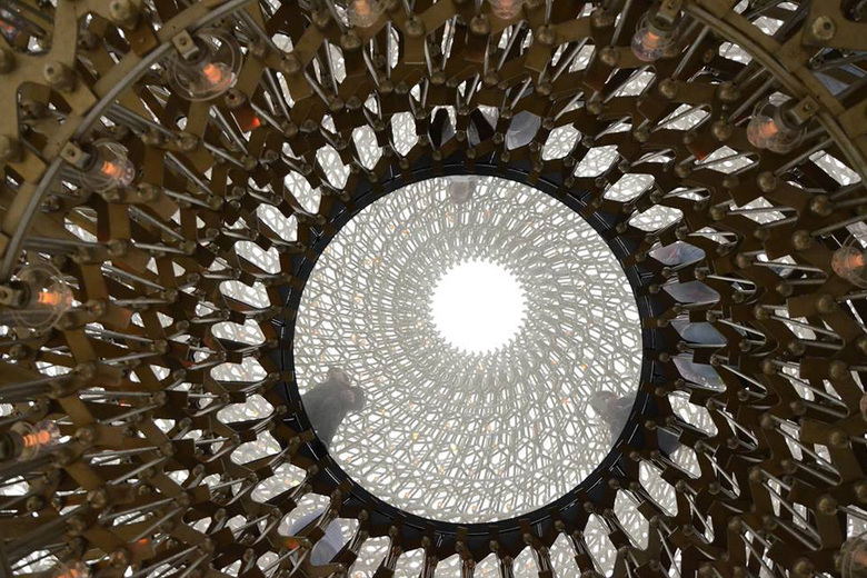 Japanese artist Takahiro Iwasaki has suspended an intricate wooden model of the Shinto shrine of Itsukushina in the National Gallery of Victoria as part of his Reflection Model series.