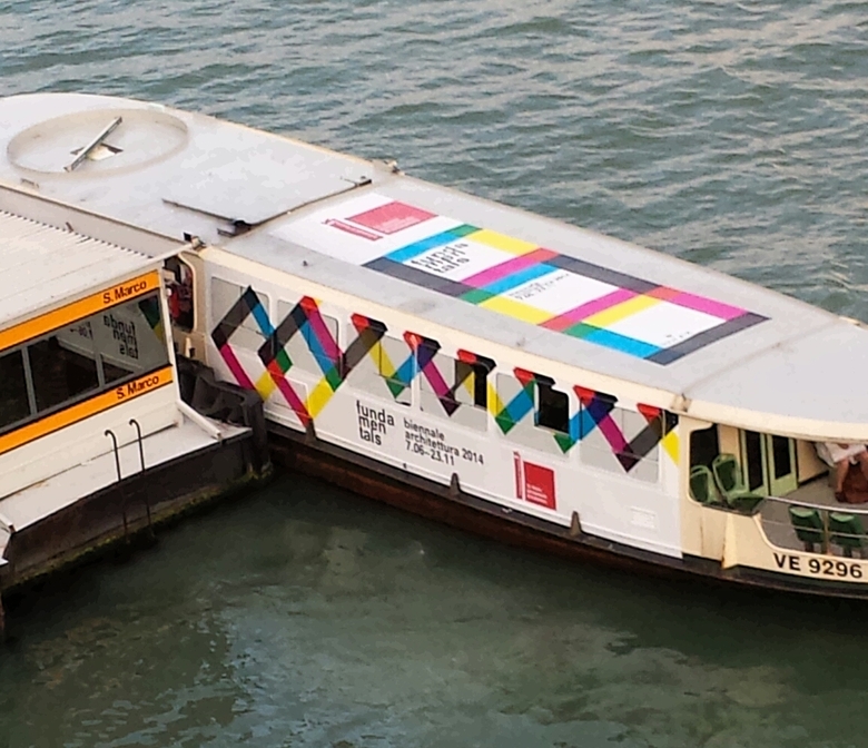 The World-Architects team has arrived in Venice for the Biennale. Be sure to check in daily, as we'll be posting to the Daily News throughout the week. Pictured is a vaporetto with Irma Boom's graphic treatment for Fundamentals.