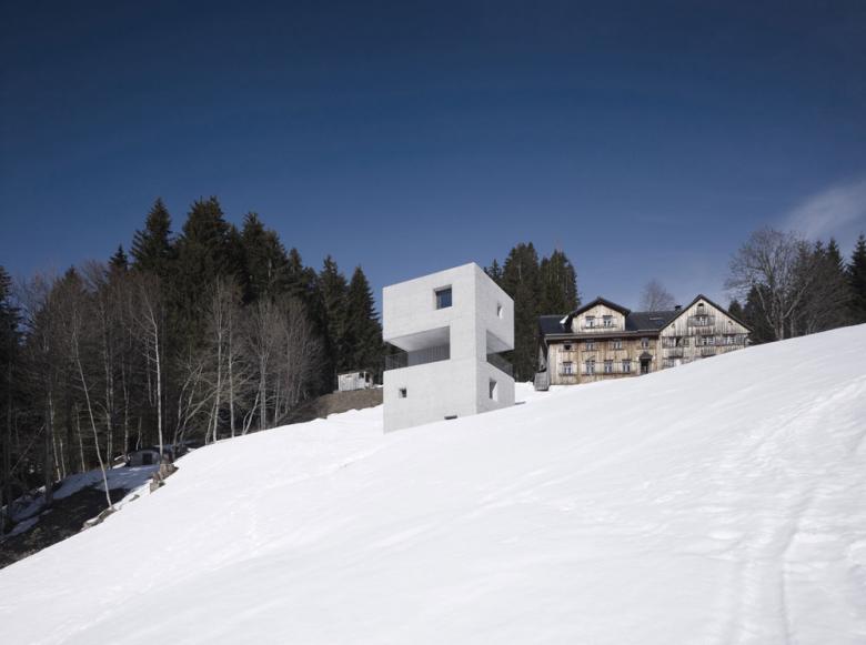 „Schutzhaus“ nennen Marte.Marte Architekten zwar das kleine Haus, das sie im Vorarlberger Laternsertal an den Rand eines bewaldeten Tobels direkt in einen Schihang gestellt haben. Das in Wirklichkeit aber ein kleines feines Ferienhaus ist. Findet in ihm doch nicht der einsame Wanderer...