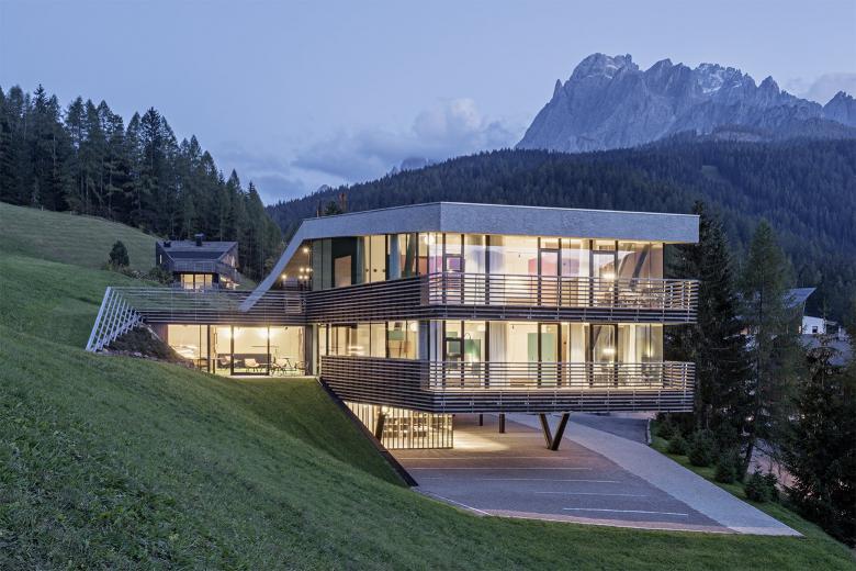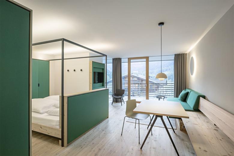 The interiors are always characterized by a strong relation with the external space. The dominant material, as for the design of the wooden façade, is the local larch wood. The wood is combined with color accents, with variations depending on the floor.