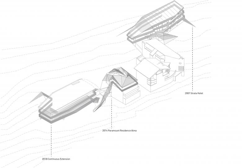 The combination of building and topography, the concept of use of the same materials, faceted wooden strips and interiors full of light with accented colors will continue in 2014 in Paramount Alma and in 2018 in Continuous Extension.
