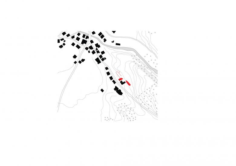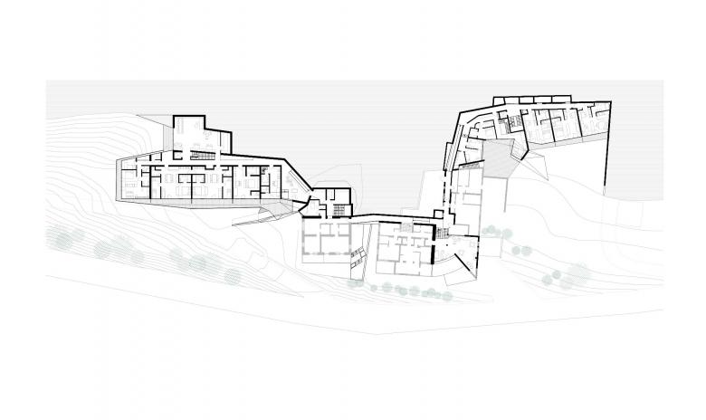 In 2018, the building will be extended again: the steep slope will be excavated and a new volume will slide behind; the larch sticks will be used once more, trying to extend to the topography, but this time they will develop along the ceiling of the ground floor, where the entrance is located, and they will define a thematic conclusion to the complex of buildings.