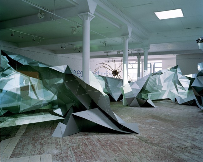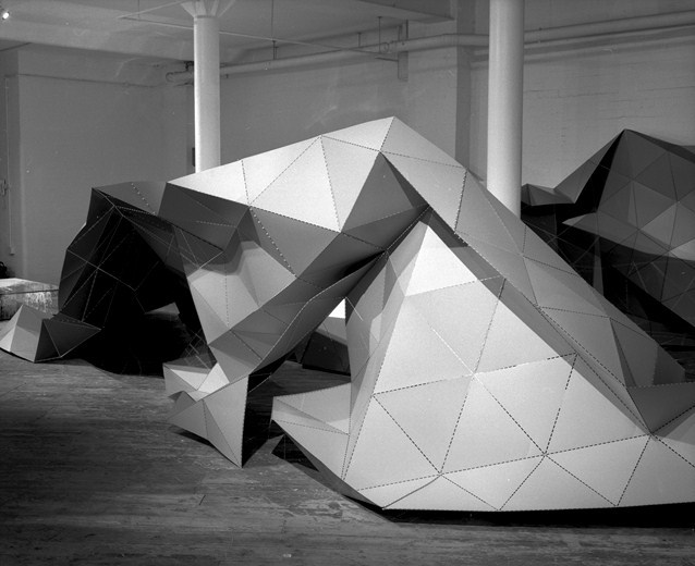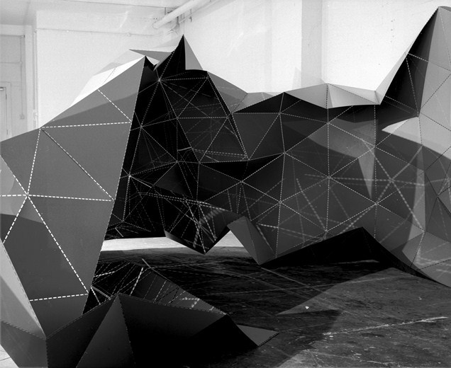 Bypassing the typically linear process of design followed by construction, and reversing traditional skeleton structural systems Plasma Studio programmed a pile of standard industrial sheet steel with information in the form of perforated seams. As in recent automotive strategies, the seemingly weakened material organization enables a formation of global stress distribution lines achieving a different kind of structural performance.