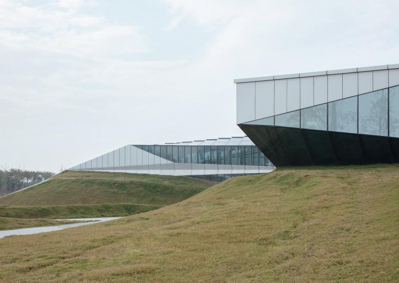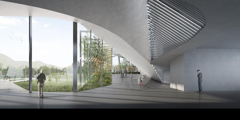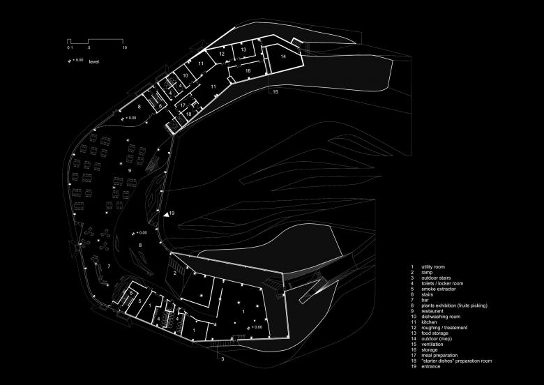 The experience offered to dinners includes picking their own vegetables and following its cooking process. In addition to the dining experience, the project proposes some auxiliary activities such as a children playground and a greenhouse, both included in the internal layout of the restaurant. Such functions and their distinctive spatial requirements—both layout and materiality—are woven into the two ribbon like bodies converging by the entrance. Morphologically speaking, the building grows from the topography at the north, evolving into a sinuous body that splits creating a gap for natural light and a vertiginous volumetric drop at the entrance plaza. Toward the south, it sits onto an artificial higher elevation, hence allowing for a series of ludicrous spaces (children playground and greenhouse) that play with the slopes through some slanted surfaces, among which we locate the main access ramp to the upper floor. The butterfly house is located on the south outer ring of the building. With the comparison of the continuity on the north side, the butterfly house is inserted into the building as a glass case that brings the landscape indoors. At the same time, a series of spaces are generated as an integrated body that interweaves the landscape, the playground and the two main floors of the restaurant. Diagrammatically speaking, the building is a major arc with both of its end points at the lowest elevation (+0.00m) and its middle point at the highest elevation (+3.80m). The three-dimensional spatial distribution resembles a ascendant spiral movement which is actualized by a membrane that more than covering/enclosing the internal area of this arc, augments the rich plasticity of the diagram as such. On the north side, at one of the endpoints, this roof is generated by 5 curves that bifurcate from linescoming out of the surrounding topography. These curves runalong various elevations, working as a veritable extension of theground to the roof of the building showcasing striations and depressions—topographic features in themselves. At the south side, at the other end point, two of the controlling curves of the roof drop dramatically reaching the ground, while the other remaining curves stay at a higher elevation. The former movement generates a “valley”, as seen from the outside. From the inside, this depression articulates the ascendant spiral of the main ramp, onto which the children playground and greenhouse are unfolded.