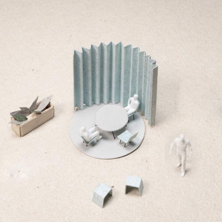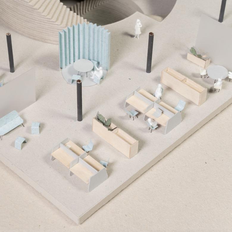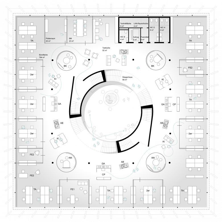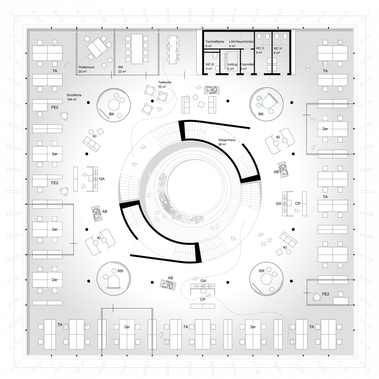 Das Rückgrat des Hauses, das prägnante, kommunikative Treppenhaus ist Weg und gleichzeitig ein lichtdurchfluteter, zentral belichteter Aufenthaltsraum, welcher die Geschosse miteinander verbindet und das ganze Haus symbolisch fasst. Fokus-Boxen für konzentriertes Arbeiten, Desksharing, über kommunikative Meeting- und Besprechungszonen bis informelle Teeküchen: Verschiedenste Raumprogramme können flexibel rund um die Treppen-Doppelhelix angeordnet werden. Diese dient als informeller Meetingbereich mit Sitz-Podesten und ist das verbindende Element zwischen den Geschossen.