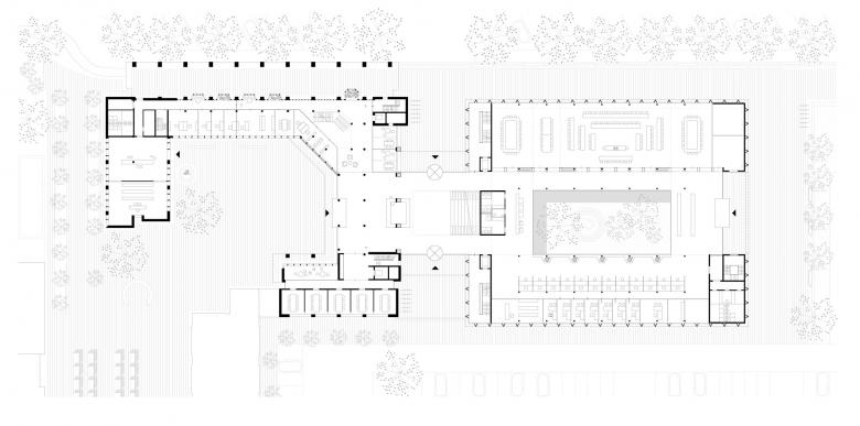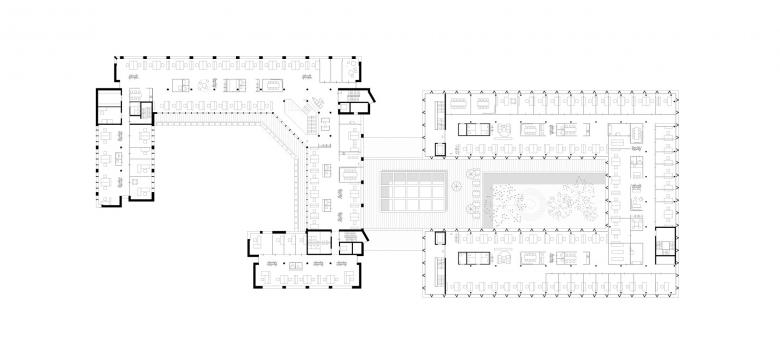 Das großzügige, lichtdurchflutete Foyer im Zubau ist die neue Mitte des Ensembles – wie ein Stadtplatz mit Wegkreuzungen, der Außen- und Innenraum, Alt und Neu demokratisch und fließend miteinander verzahnt. Zwei Körper werden zu einem Organismus. Die C-Form des Bestands dockt sich über eine Passage mit Lichthof an die U-Form des Zubaus an.