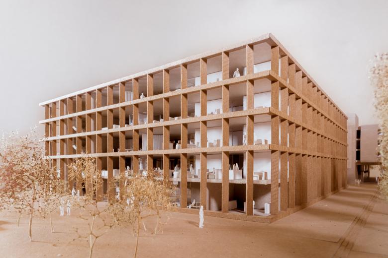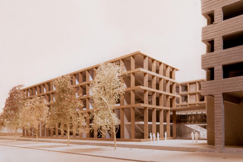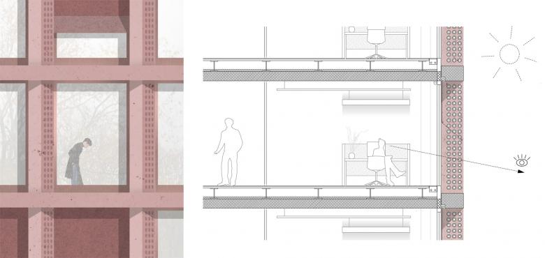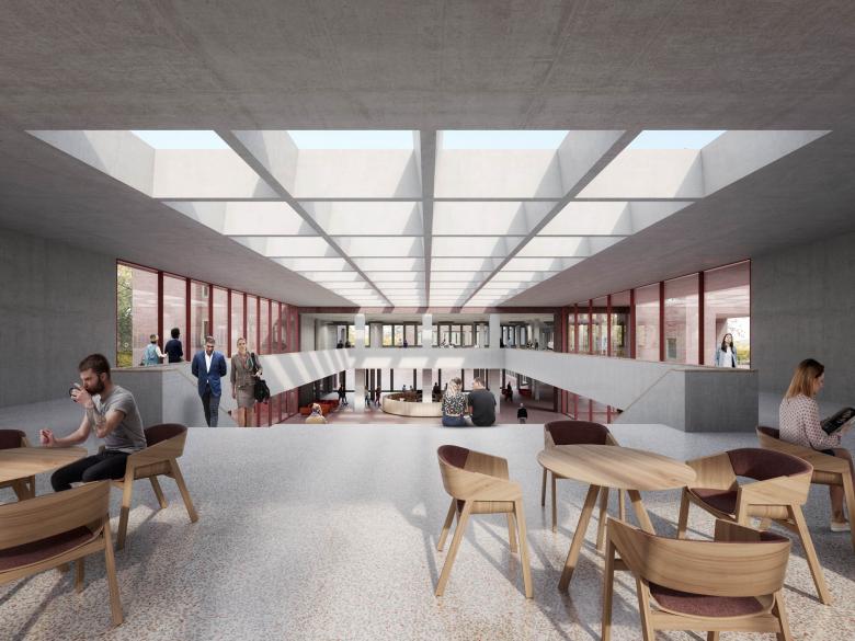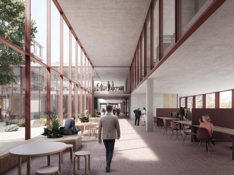 Die plastische Fassade wirkt mit ihren vertikalen, perforierten Dreiecksstützen und liegenden Balken ruhig und elegant. Sie gibt sich dennoch kommunikativ und transparent zur Stadt. Eingefärbte Betonfertigteilen interpretieren die regional typische Klinkerfassade des Bestands neu. Der Klinkerbelag im Foyer unterstreicht den öffentlichen Platzcharakter und holt die Stadt in den Innenraum. Die Grundrisse können individuell angepasst werden: Großraumbüros, Desk Sharing oder das klassische Arbeitszimmer, je nach Bedarf und Pandemielage. Ein einheitlicher, gediegener Farb- und Materialkanon im Alt- und Neubau schafft eine gediegene und zugleich einladende Atmosphäre.