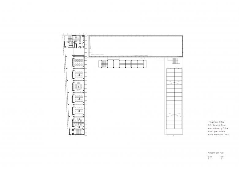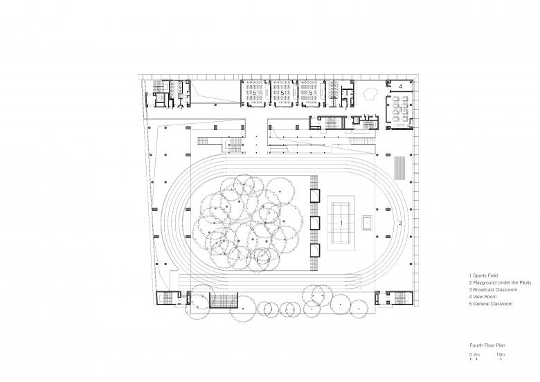 Our first challenge was to address the onerous site conditions for the design of a school with thirty-six classrooms. Restricted in size and by the existing trees, the site also has an over sixteen-foot height difference from north to south. A comb-shaped layout, which is commonly seen in conventional school designs, would not be appropriate for this project, as the goal is to ensure maximized preservation of the little forest. Through a series of iterative studies, a compact vertical massing strategy was assessed to be the most suitable approach, minimized in footprint while enclosing the site from three sides. To reduce the interference in the existing site by the new buildings, classrooms are positioned at the perimeter, enclosing the little forest on the north, south, and east. Sports facilities that are often large in scale are reorganized through a vertical arrangement of sports grounds dispersed on the rooftops and throughout the semi-subterranean spaces. The running track is elevated, with only its structural elements touching the ground. Nested within the loop of the track is the little forest, offering continuous canopies right above where students run and wander. We wanted the building to be fully adaptive to the local climate and for the architecture to radiate a charm that belongs only to southern China. Therefore, generously sized semi-outdoor public terrace spaces are devised within the relatively compact building massing. Offering ample shelter and shade, as well as sufficient natural ventilation, they form a vital place on campus that facilitates activities. These terrace spaces are plugged into the running track at various moments, with openings looking toward outside, through which one can catch a glimpse of the city when jogging. People on the street can also look inside and see the little forest via these openings. Arranged horizontally, terraces, corridors, and the running track are at once connected and juxtaposed with vertically distributed sports grounds and circulation spaces. Together they create an integrated multi-dimensional spatial system for campus activities.