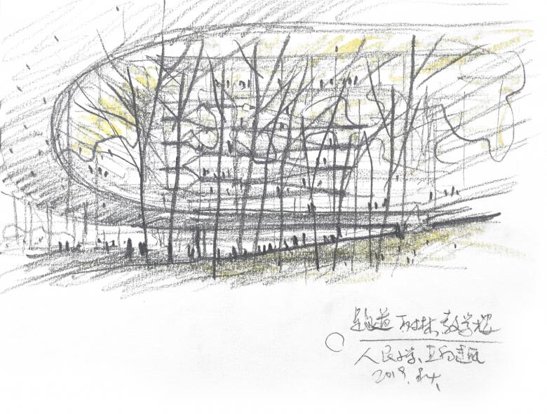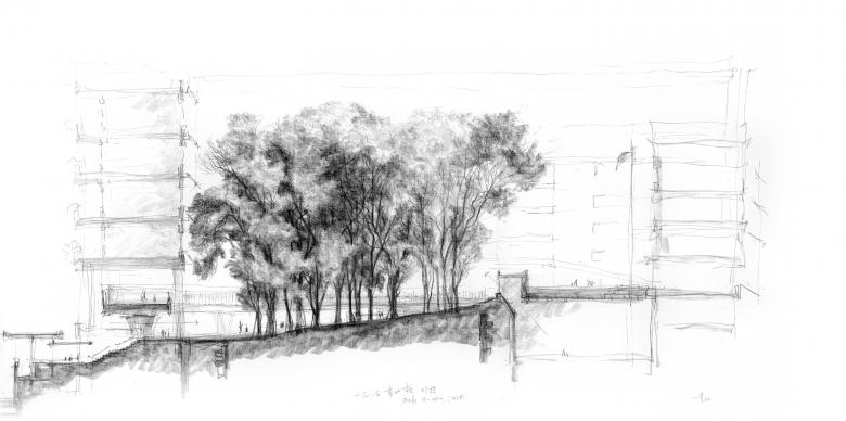 Liyuan Foreign Language Primary School is located in the heart of Futian, Shenzhen’s central district. Densely surrounded by buildings, on site there is a leafy “little forest”. Upon entering the forest, one’s eyes are instantly drawn to the interwoven canopies sweeping above like clustering umbrellas. Two decades ago, this area was occupied by factories and warehouses, which were later relocated as the city developed, and the site had then been used for soil disposal. Today, standing over sixty feet tall, banyan trees planted on the resulting mound have grown into this small, precious forest. The design proposal aims to maximize the preservation of the existing forest and its terrain, while seeking to explore new typologies and spatial innovations for campus architecture.
