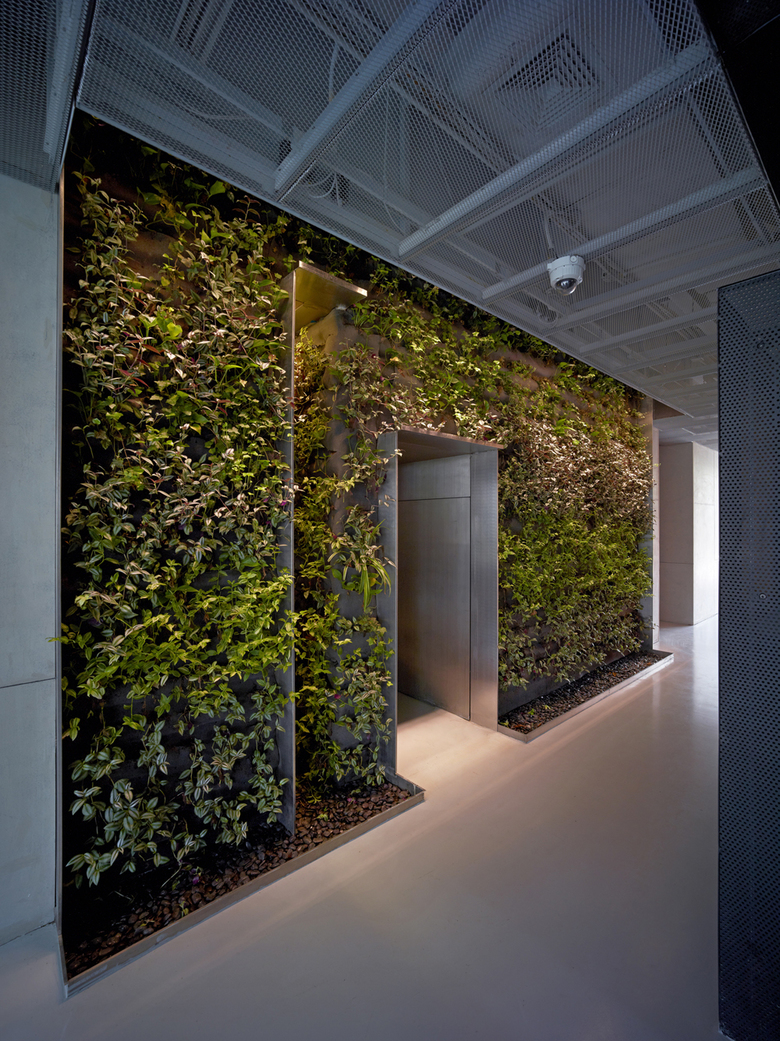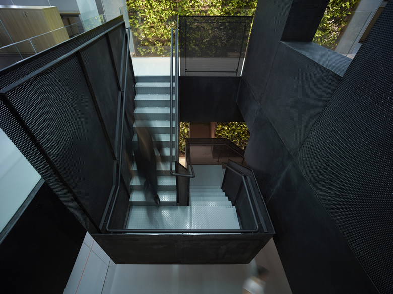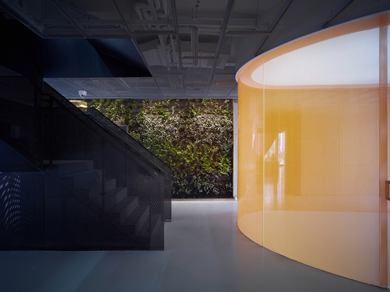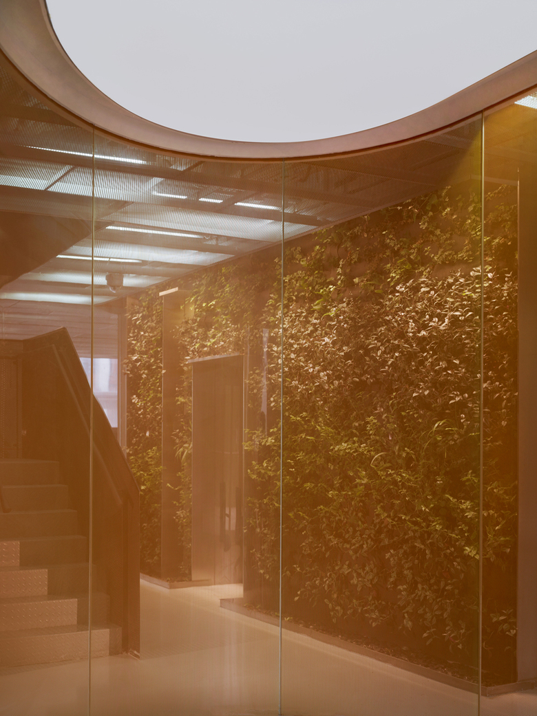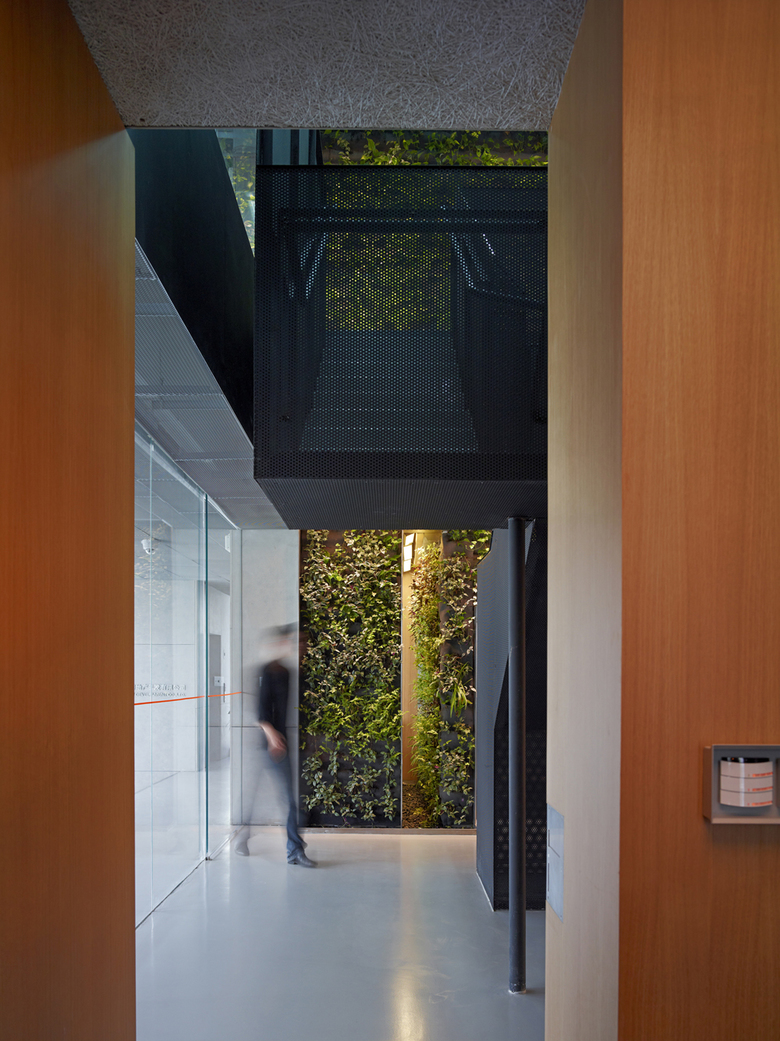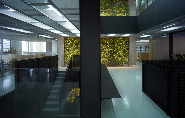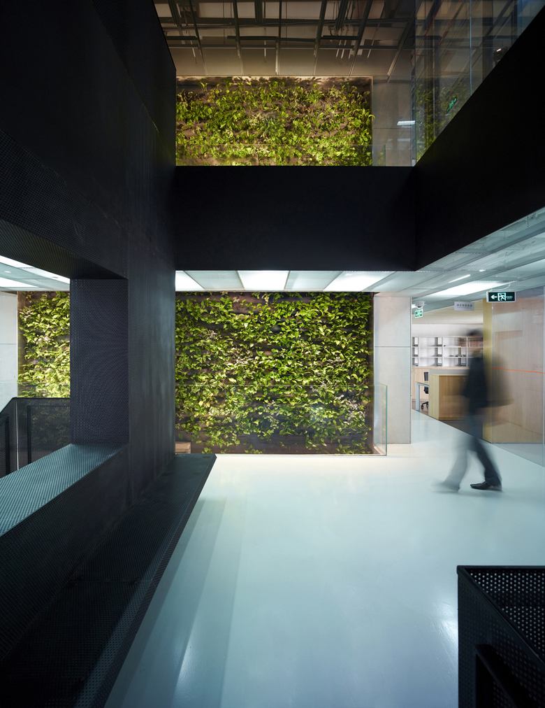 The public life system starts at the lobby at first floor, and ends at the waiting and chatting area under a skylight at the third floor. Its material pallet is unique from the regular work area around, consisting of perforated steel panel, self leveling concrete, prefab concrete panel and vertical green wall. The green wall, with an automatic water irrigation system embedded, not only becomes a unique visual character of each floor, but also consistently assists indoor air quality improvement by the large amount of vegetation growing on top of it.