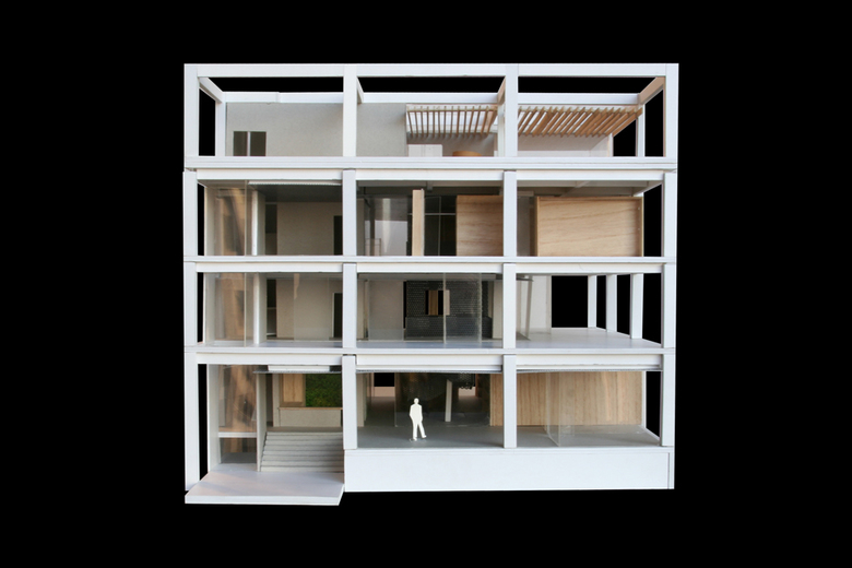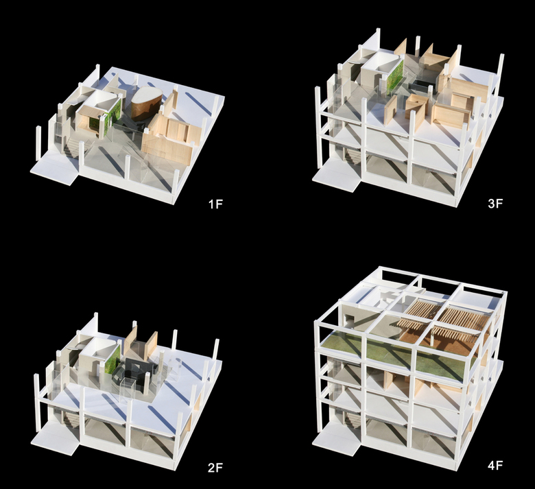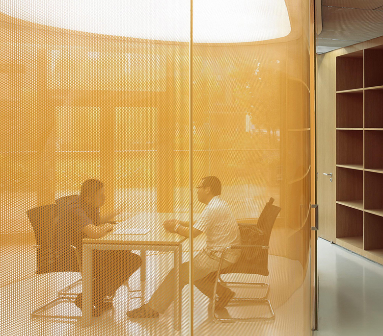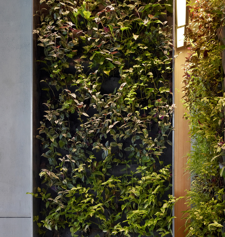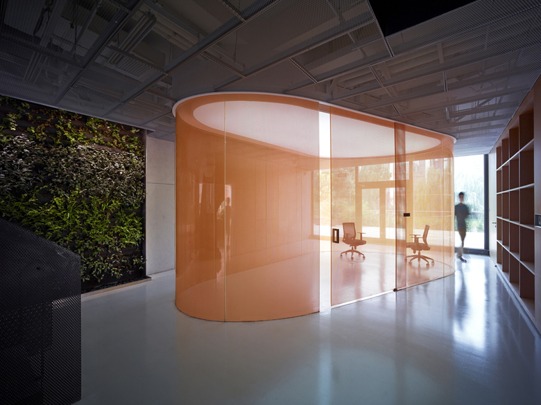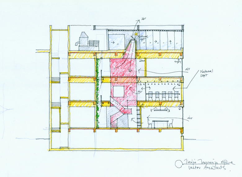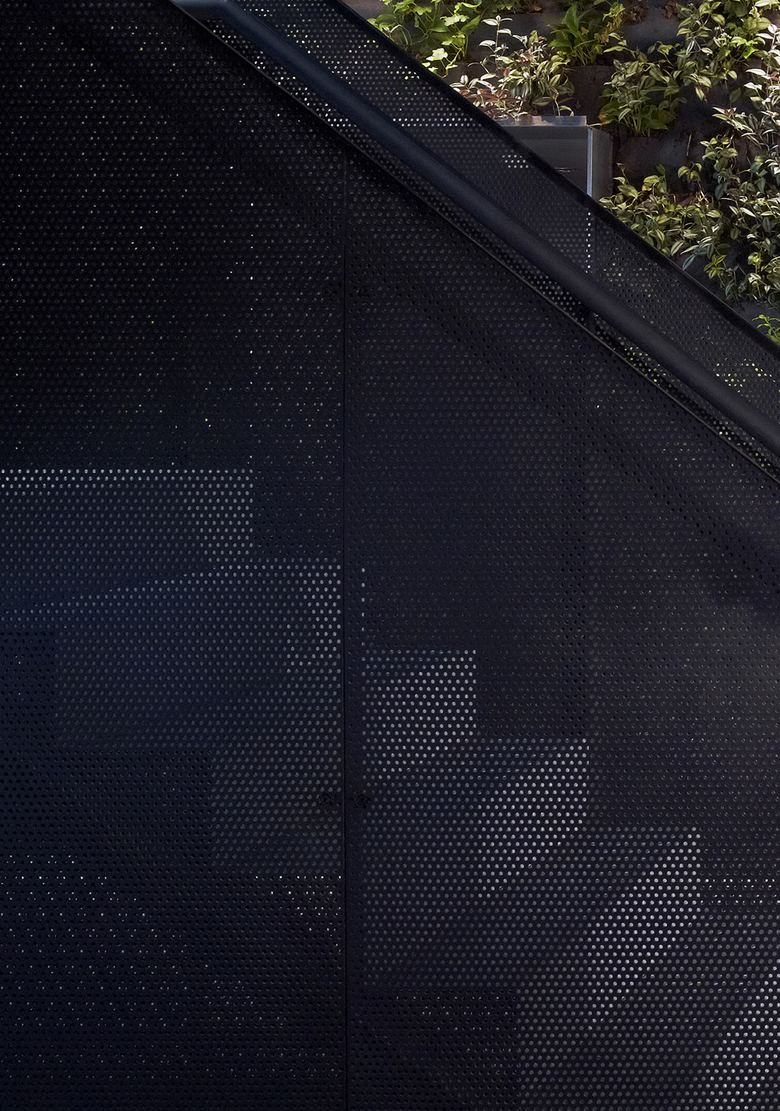 The public life system starts at the lobby at first floor, and ends at the waiting and chatting area under a skylight at the third floor. Its material pallet is unique from the regular work area around, consisting of perforated steel panel, self leveling concrete, prefab concrete panel and vertical green wall. The green wall, with an automatic water irrigation system embedded, not only becomes a unique visual character of each floor, but also consistently assists indoor air quality improvement by the large amount of vegetation growing on top of it.