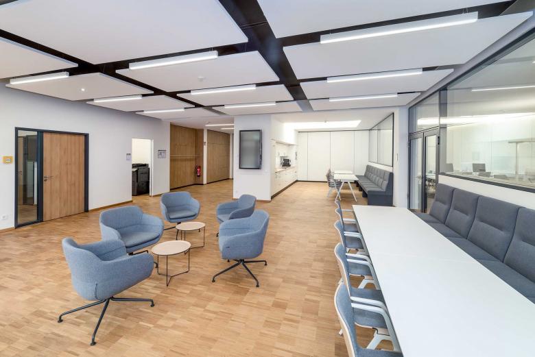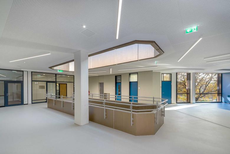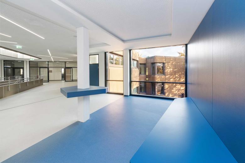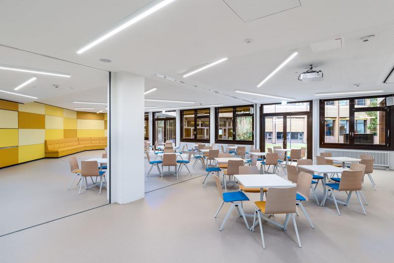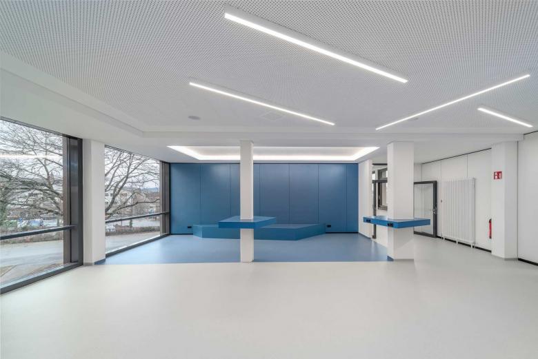 Besonderes Augenmerk lag auf der Barrierefreiheit des Gebäudes: Stufenlose Eingänge und ein erneuerter Aufzug gewährleisten den Zugang zu allen Bereichen. Durch die Auflockerung der Grundrisse und den Entfall von Bestandswänden wurde eine offene, lichtdurchflutete Atmosphäre geschaffen, die die Kommunikation und das Miteinander fördert. Ein durchgängiges Farb- und Materialkonzept unterstützt die Orientierung im Gebäude und sorgt für eine angenehme Lernumgebung.