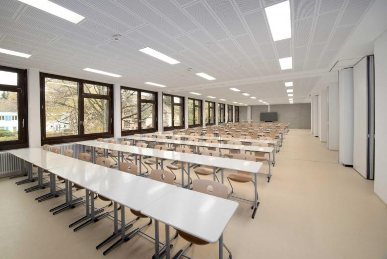 Das Gebäude umfasst drei Geschosse: Im Untergeschoss befinden sich neue Fachräume für Chemie, Biologie und Physik, ergänzt durch Technik- und Lagerräume. Im Erdgeschoss wurden die allgemeinen Unterrichtsräume modernisiert, während das neue Schülercafé mit Kiosk und die angrenzende Pausenhalle durch mobile Trennwände flexibel nutzbar sind. Diese Halle kann bei Bedarf zu einem Veranstaltungsraum erweitert werden. Im Obergeschoss sind neben der Schulverwaltung und dem Lehrerzimmer flexible Konferenz- und Prüfungsräume untergebracht, die sich an die verschiedenen Anforderungen des Schulalltags anpassen.