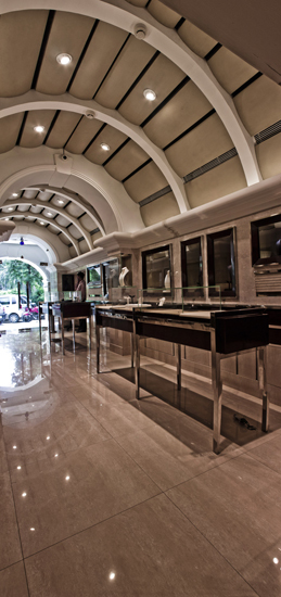 The fine jewelers were given a colonial ambience to their showroom with archways, cornices and vaulted ceilings along the length of the showroom. A luxurious and opulent colour palette of beige and burgundy was chosen for this project to accentuate the colours and cuts of the jewellery that was going to be showcased here.
