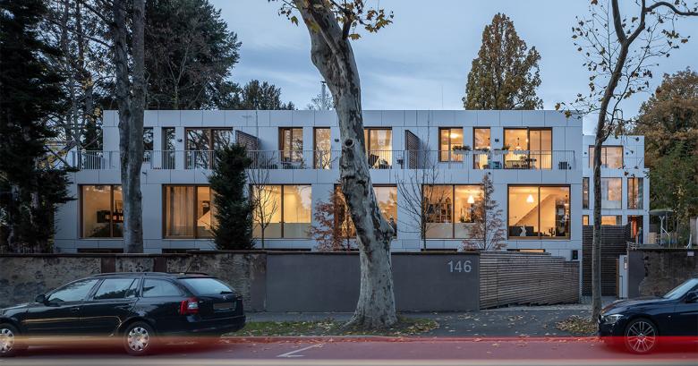 Auf einem stadtnahen mit alten Bäumen bestandenen Hanggrundstück entstand eine hochwertige verdichtete Wohnstruktur. Behutsam wurde die Bebauung aus acht Wohneinheiten in die Hangsituation eingepasst. Alle Wohnungen sind über eine gemeinsame Mittelzone zugänglich, die Bewohner und Besucher über einen terrassierten, baumbestandenen Zugang erreichen. Eine geschickt angelegte Erschließung der Tiefgarage lässt Platz für gemeinsam genutzte Garten- und Spielbereiche.