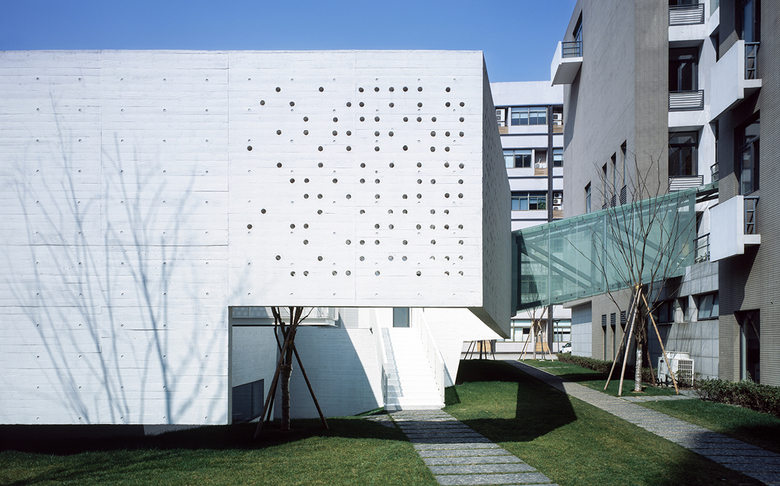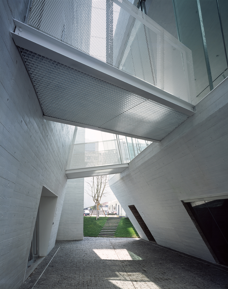 Located in the Huaxin Technology Park in Caohejing area, Shanghai, the Huaxin Wisdom Hub’s main program is exhibition and conference. Closely surrounded by roads, a parking lot and high-rise buildings, the site is very small and tight. The design challenge comes from how to respond to the paradoxical requirements from the architecture and the context. As the new building would inevitably increase the building density of the technology park, the built volume must be controlled without sacrificing its floor area and floor to floor height. Since the context is rather banal, the Wisdom Hub is better to be separated from it and creates a self-improving small world. However, as a public building, its communication aspects requires a certain degree of openness.