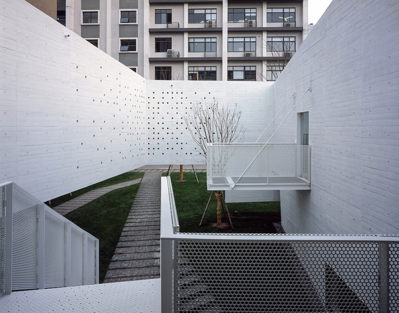 A balancing strategy is thus used. A continuous floating concrete enclosing wall sets a boundary for the Wisdom Hub within the site. Inside the boundary, the building is sunken to a half-story level and is divided into four drifting volumes per programmatic requirements. The floating wall creates an ambiguity between the inside and the outside, which not only establishes a buffer between the Wisdom Hub and the context but also expresses its publicness. The Wisdom Hub has a structural system with reinforced concrete sheer wall and thick plate. As the design hopes to reduce its visual aggressiveness and to present a sense of lightness as it is surrounded by high-rise buildings, the exterior building wall and the enclosing wall are painted white. Such dematerializing method erases some visual characters of concrete and visually expresses a sense of lightness. The interior wall remains its original status, resulting in a theatricality between the inside and the outside.