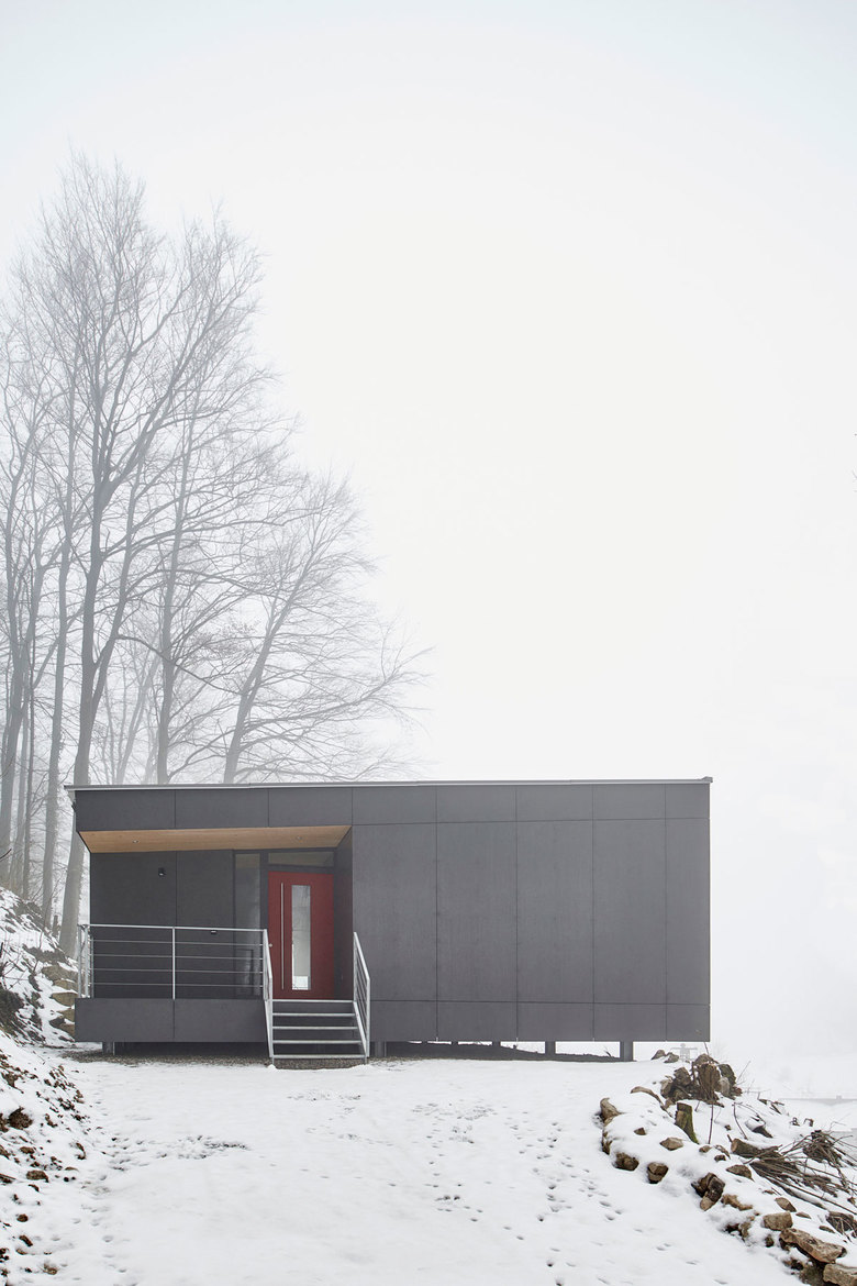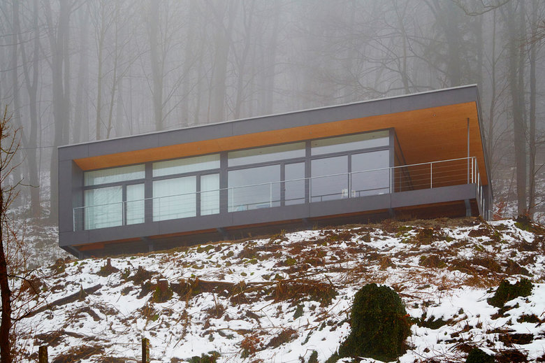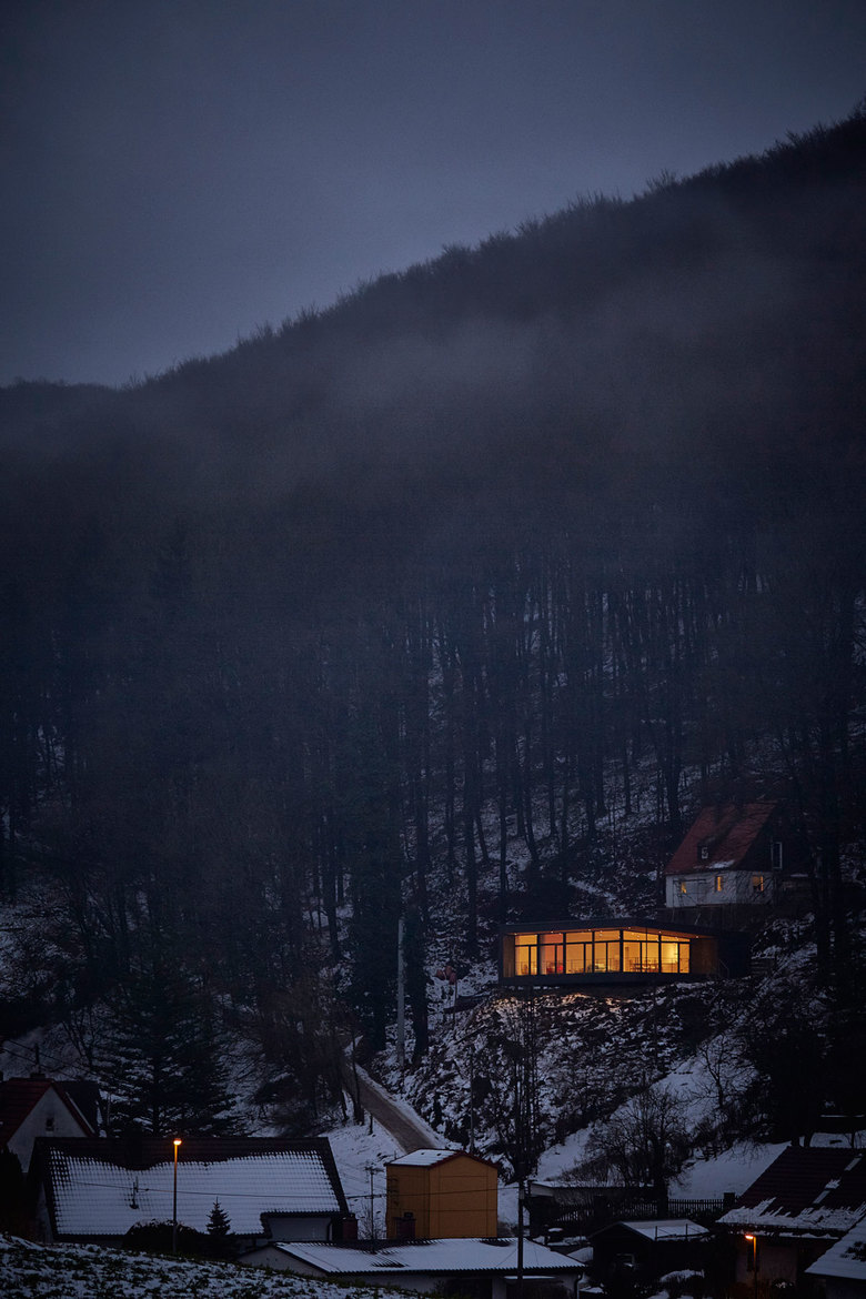 In der Hersbrucker Schweiz entsteht auf einem alten Familiengrundstück im Außenbereich ein moderner Ersatzbau für ein nicht mehr sanierungsfähiges Wohnhaus aus den 30er Jahren. Das Baufeld separiert als knapp geschnittenes Felsenplateau den bewaldeten Steilhang. Der Neubau thematisiert die Reduktion der Gestaltung. Zwei Materialen - Holz und Glas - sie stehen für Transparenz und Verschlossenheit. Gleich einer aufgeklappten Schachtel öffnet sich das Pultdachhaus mit seiner transparenten Seite zum Tal nach Südwesten. Die Wohnräume genießen über die großzügige Verglasung und die vorgelagerte Sonnenterrasse einen traumhaften Blick in die Landschaft. Zum Hang nach Nord-Osten liegen dienende Nebenräume. Die Schachtel gibt sich verschlossen. Wenige kleinteilige Öffnungen verschaffen Zutritt und Belichtung.