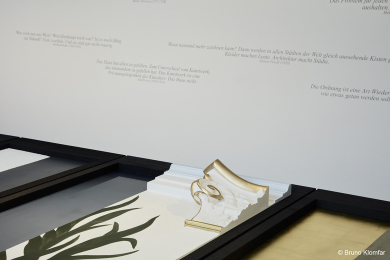 Against this backdrop, the exhibition addresses the question of the contemporary relationship between material and identity on the basis of ten projects by BEHF. Large-scale material samples represent the carefully selected material palette, chosen according to the best Viennese traditions, that gives each of BEHF’s projects its own distinct identity. A film-like collage of drawings and photographs accompanies the composition, alongside quotations from various actors whose work is both closely linked to the city of Vienna and its typical characteristics.