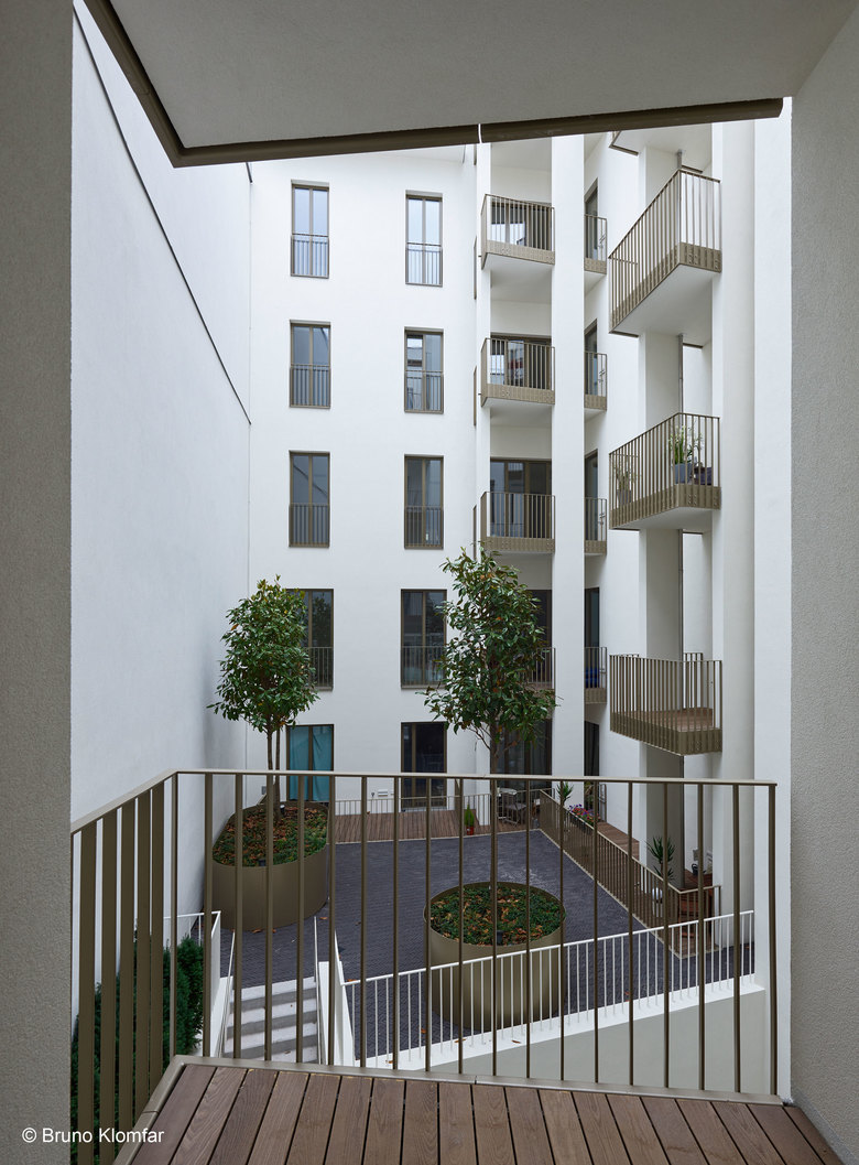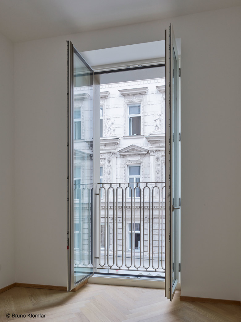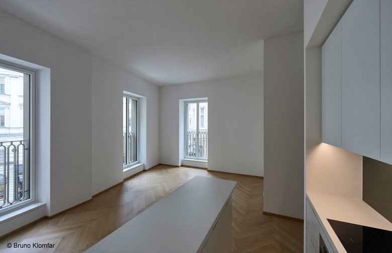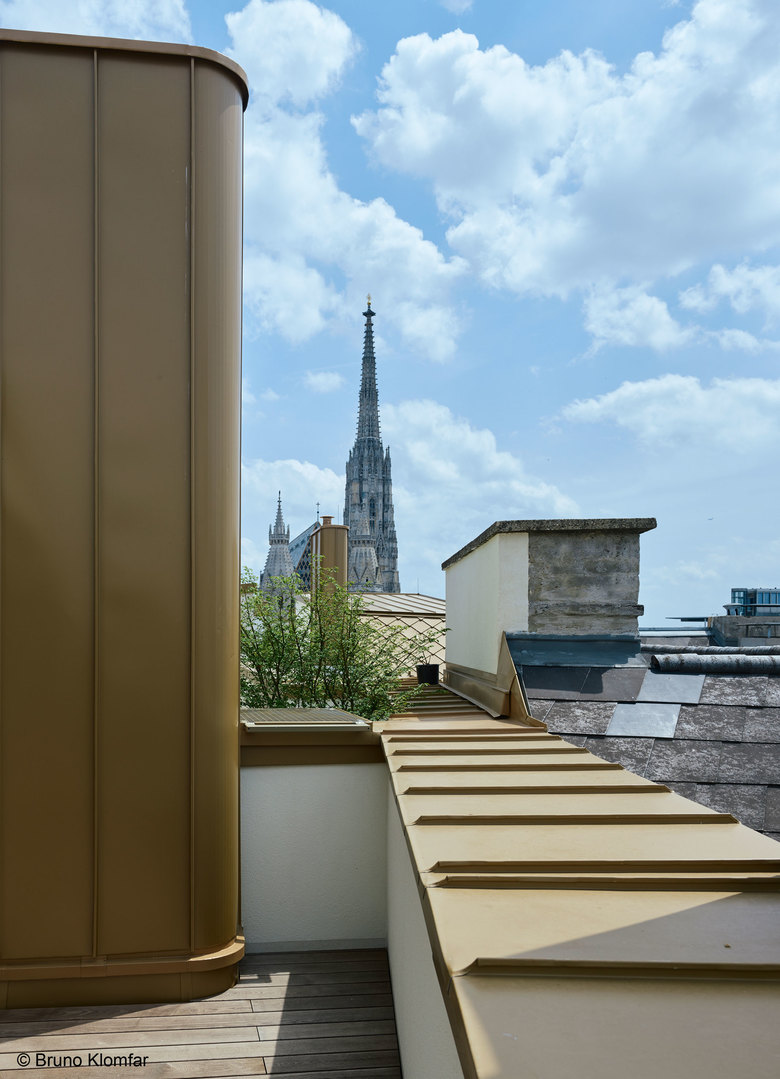 In the heart of the historic centre of Vienna, only a few minutes walk from St. Stephen’s Cathedral, BEHF Architects and Mitermair Architekten have converted the former office premises of Erste Bank situated above the legendary Café Korb into 69 inviting apartments on about 12,000 square metres. In order to comply with the city’s low-cost housing policy and ensure the affordability of housing, the architects have developed compact units, a large portion of which are smaller than 50 square metres in size. This historic complex overlooks the city of Vienna, and through the apartments’ large glass windows provides breathtaking views of well-known neighbouring sites such as St. Stephen’s Cathedral or the Zacherlhaus designed by Jože Plečnik.