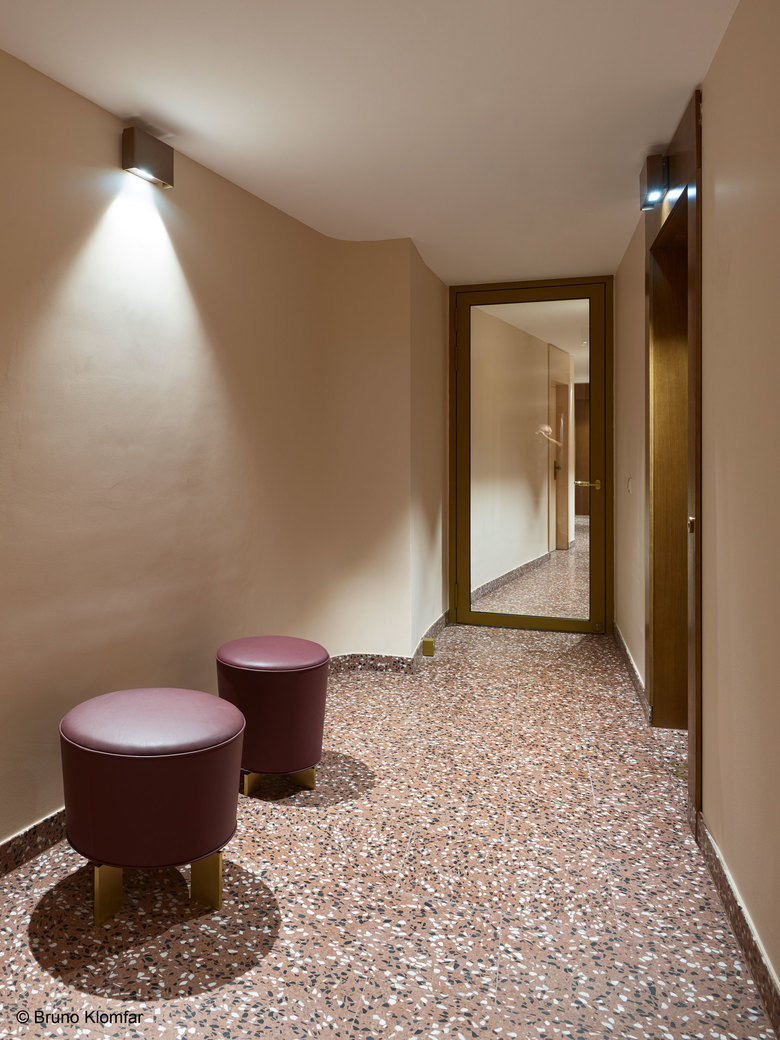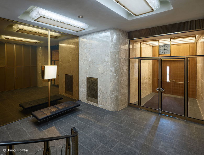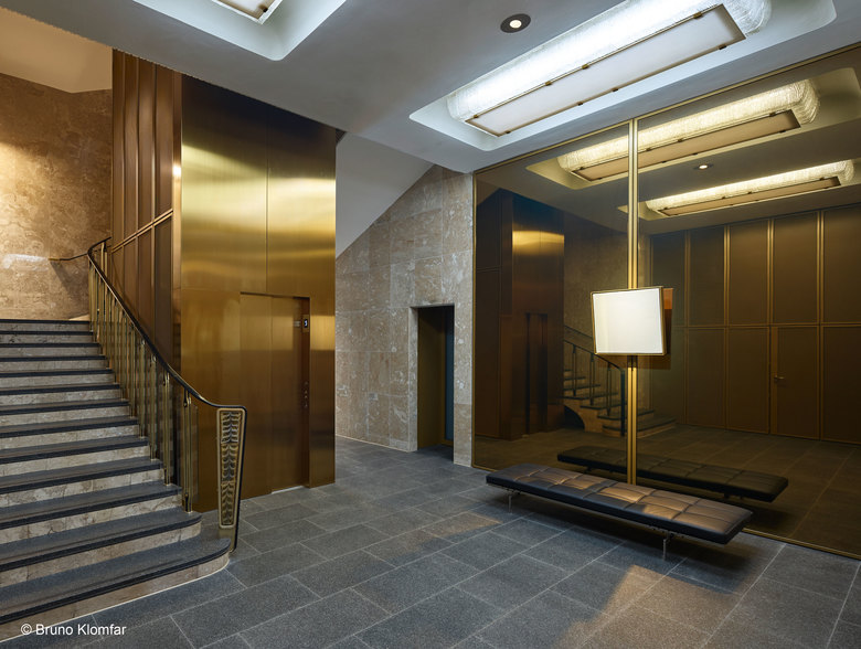 In the interior, unique parts of the original design such as a marble clad staircase with its 1960s handrail made of gold-coloured cast aluminium were carefully refurbished. It is now possible to experience the elegant charm of the 1960s in these areas.