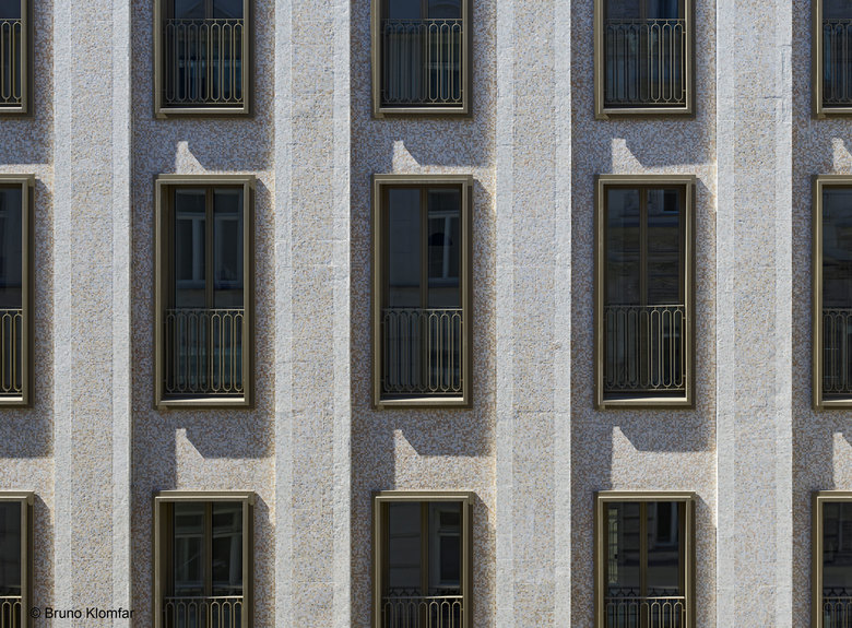 To return it to its former glory, the architects rejuvenated the ground floor natural stone-clad facade. Above, the striking facade featuring a mosaic work made up of small pieces of stone was extended. The regular window openings were developed as “French windows” and extended down to the ground. The three existing building units were merged under a single roof into a new structure to create a desired harmony between old and new buildings in the urban fabric. The architects developed balconies and terraces oriented towards the courtyard. The top floor apartments were enriched with dormers in a pearl gold colour.