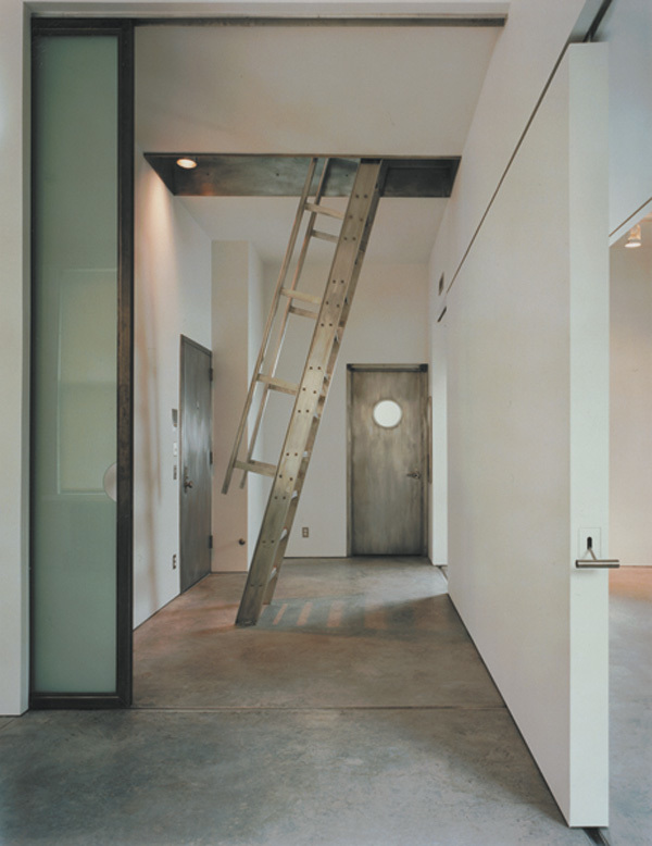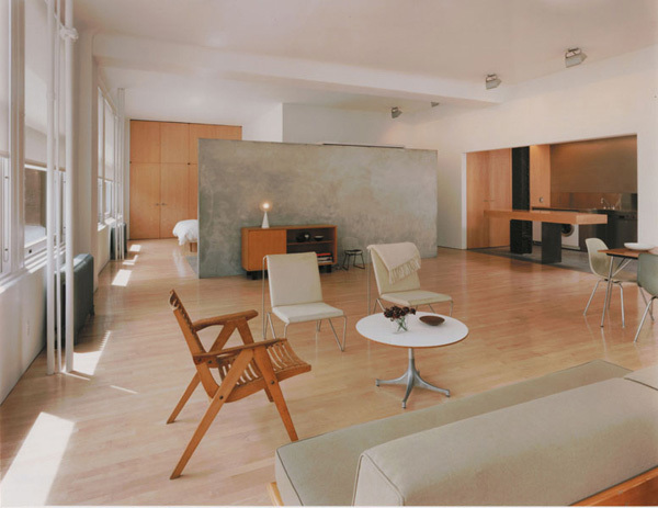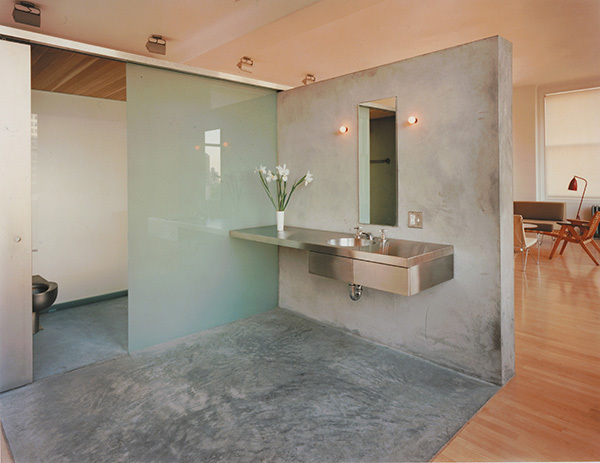 Vertical combination of two 1500 SF loft apartments to create office, studio, and living space for an individual involved in the arts. The entire project is rendered in basically five materials: concrete, plaster, maple, stainless steel, and glass. To enforce separation between work and living areas, the two floors are connected internally by only a metal ship ladder.