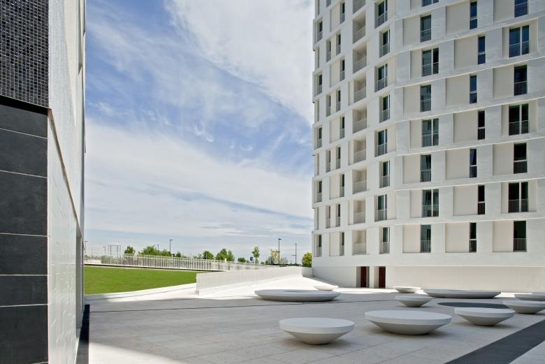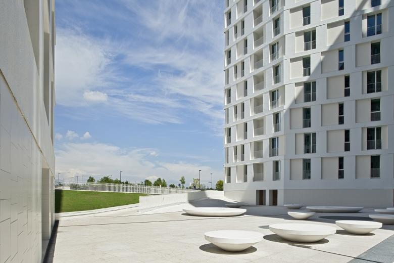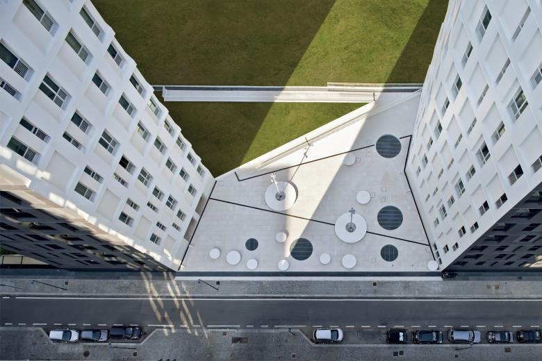 The project is critical of the concept of the 'gated community'. By giving public space to the surrounding community, C+S Architects physically design a square in material and chromatic continuity with the towers, which underlines the importance of sharing the collective space as a key point to strengthen the identity of the community. The square is a free, durable, open public space, accessible to all (including the visually impaired) that connects the difference in height of about two meters between the park and the street, through a series of ramps. But it is also a fun public space capable of transforming itself into a playground for children or skaters, for rest and play.