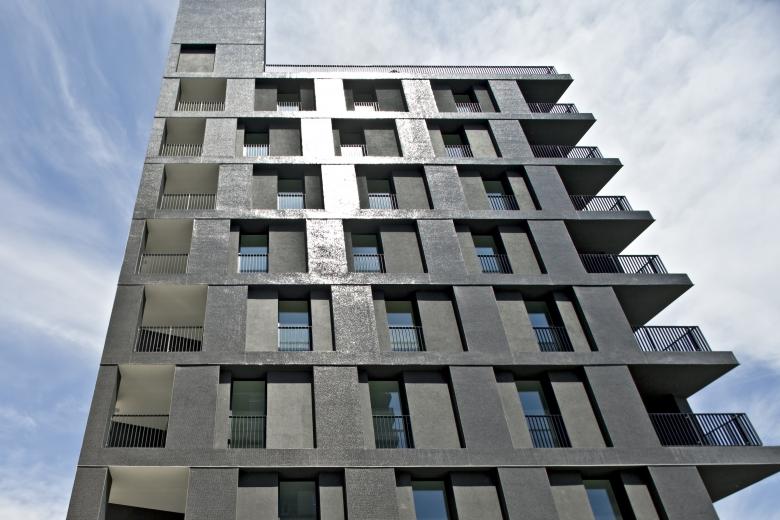 On the sides of the square two towers (fourteen and twelve meter high) define the space and seem to have been generated from the same volume, split in two by the public space. The two towers develop 10,830 square meters, distributed in 103 flats, all sold as affordable housing according to the Regional regulations. The ground floor of both towers houses the entrance hall and service spaces, such as bicycle storage, common room, gym, laundry and storage room for separate waste collection. C+S project was a pioneer, in 2011, in introducing ESG drivers when inserting hybrid and common spaces within the residential complex.