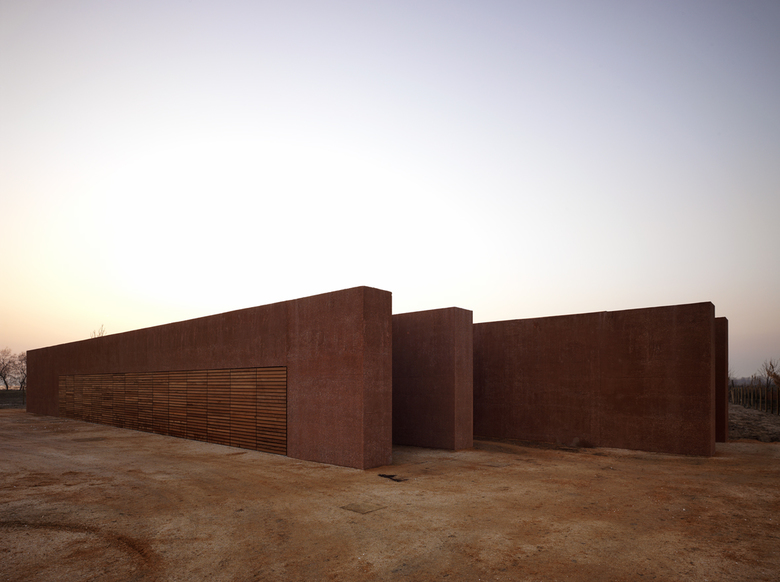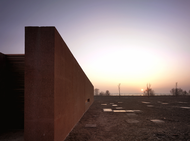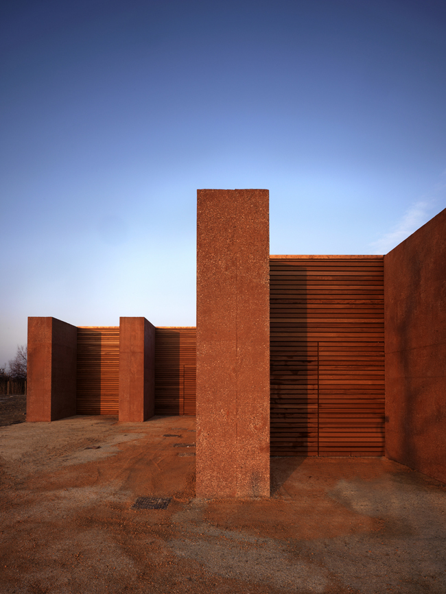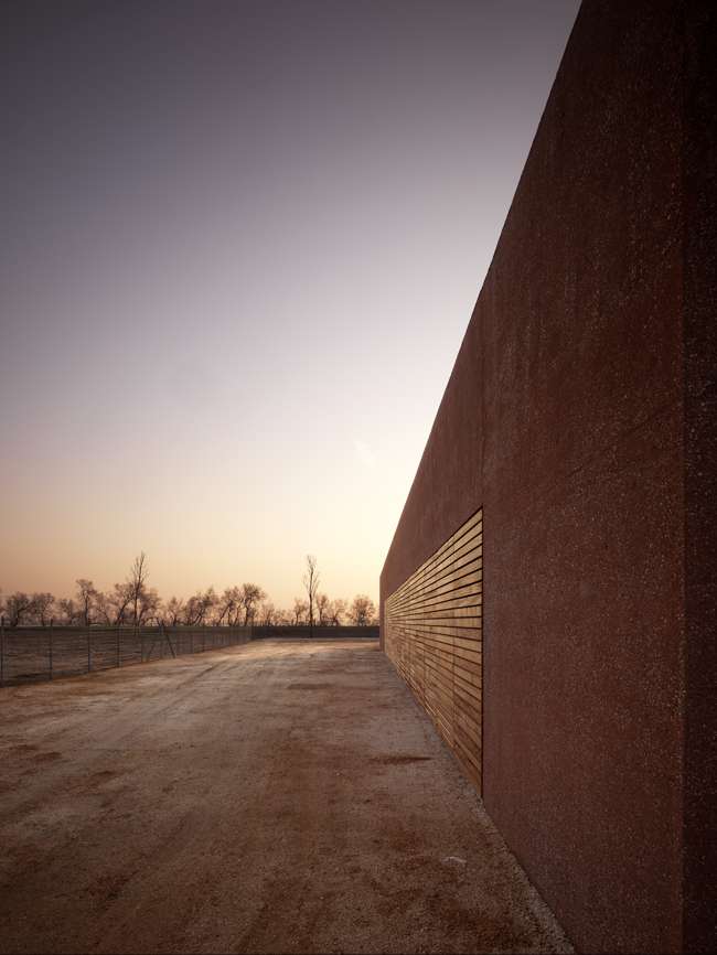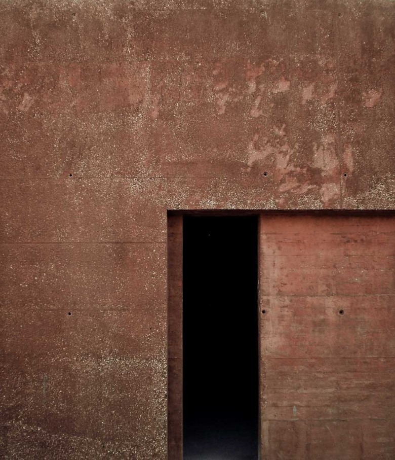 Four one meter thick parallel walls, built in reinforced concrete colored red with pigment constructed as rough, untreated surfaces give the space the building form, like the ruins of an old battery, at the same time defining structure and shape.