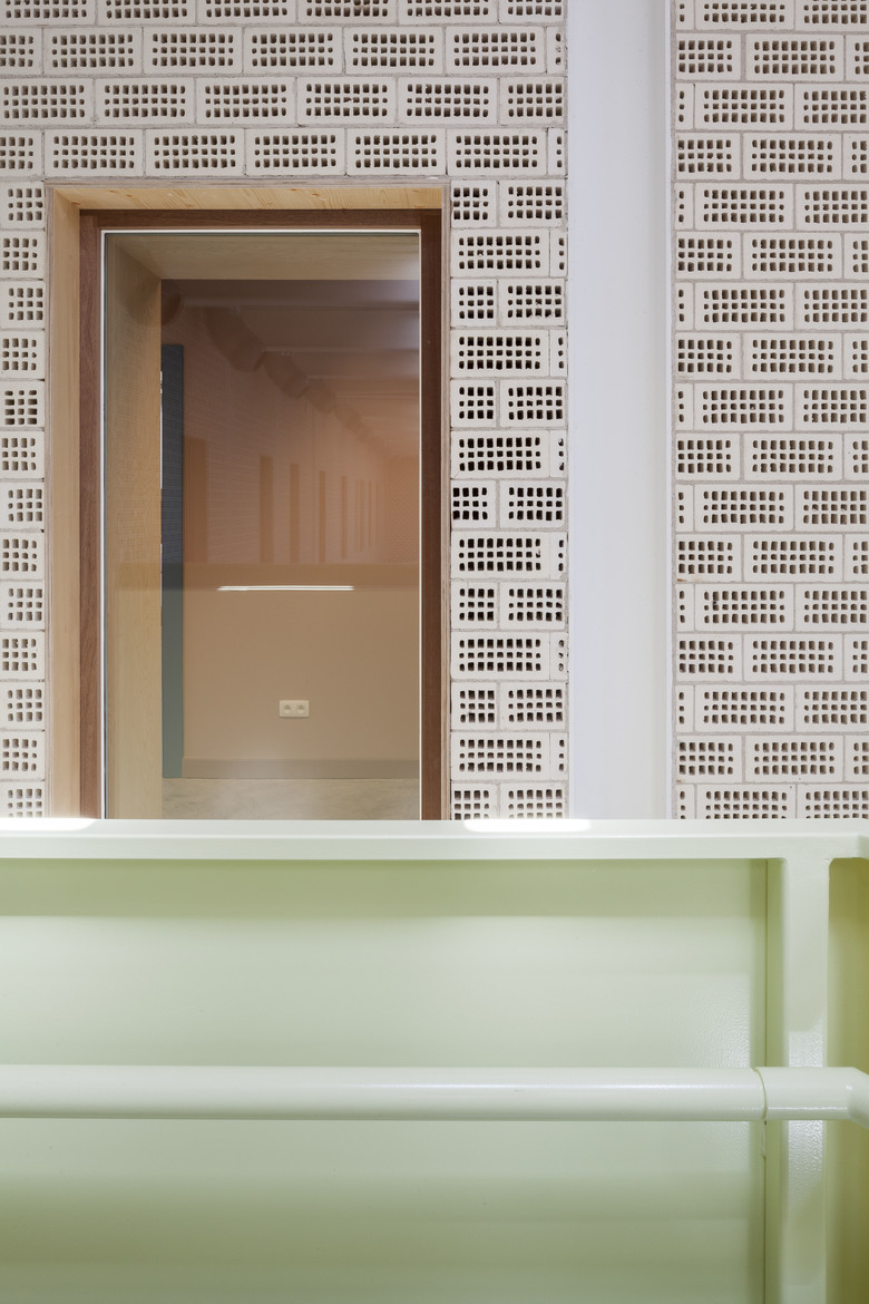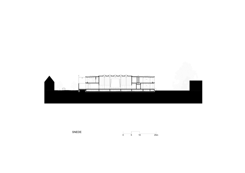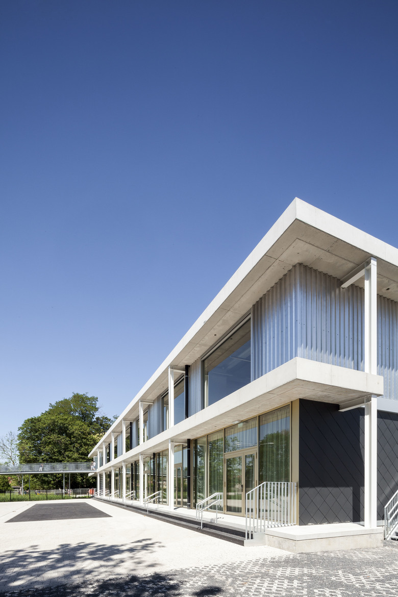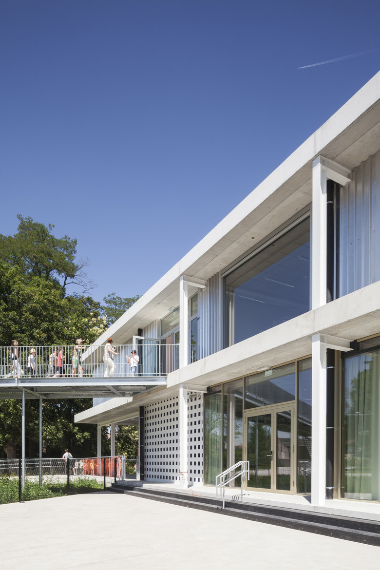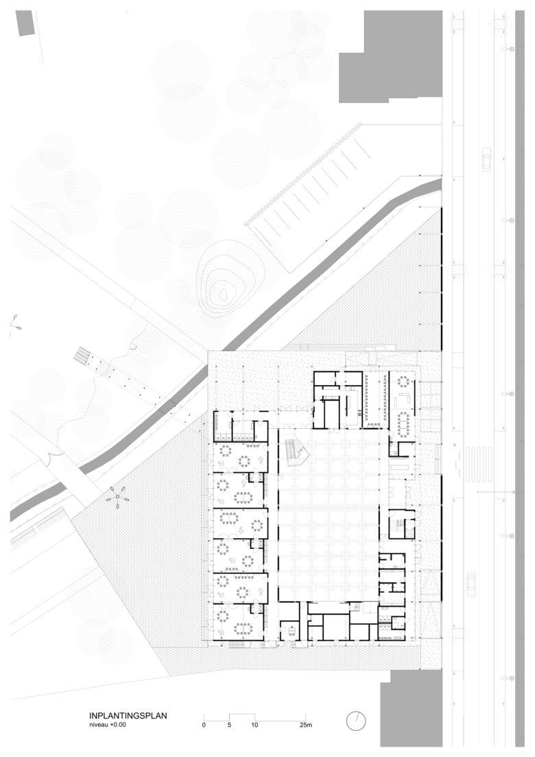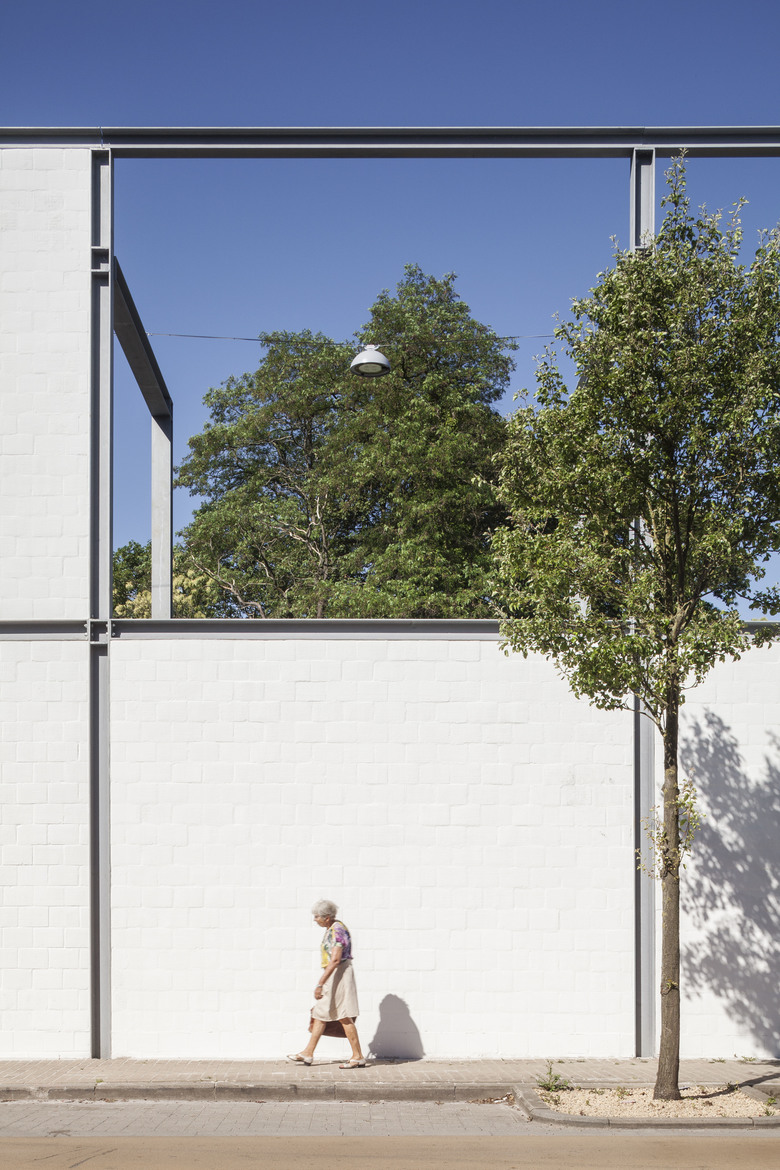 De structuur wordt op 5 meter van de rooilijn geplaatst. Om RUP-conform te blijven, zetten we op de rooilijn de gevraagde witte gevel. Tussen gevel en structuur ontstaat een open ruimte die als buffer dient om kinderen en leraars op te vangen. We noemen deze ruimte de vestibule: Het is een autovrije zone voor wachten en toekomen, spelen en observeren, een ouderruimte, een zone waar je een kijk op de werking van de school krijgt.