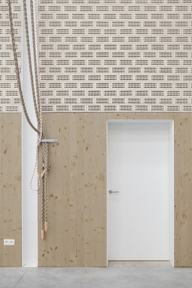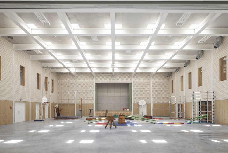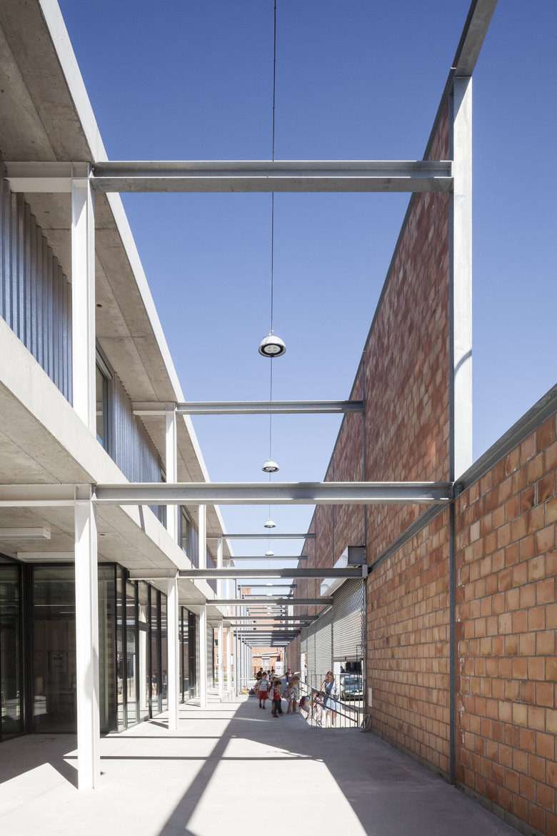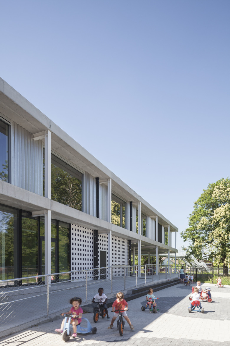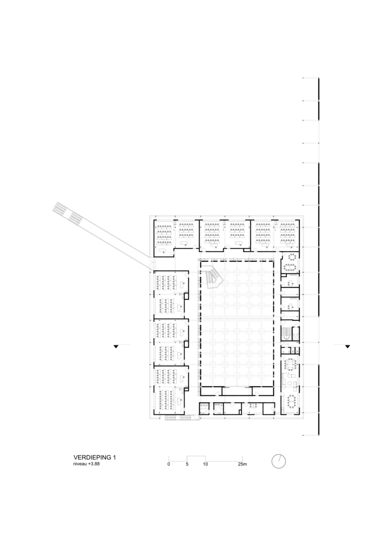 Waar de structuur het ijlst is, waar ze bijgevolg de grootste overkragingen heeft, daar zit het hart, de open ruimte, de buik van de gemeenschap. Deze grote atriumruimte wordt omkranst met gelijkaardige stalen grid's die andere ritmes en densiteiten aannemen: daar waar de klassen worden voorzien, is het grid basaal acht bij acht meter. Tegen de straatkant aan wordt het fijner waardoor het geschikt is om bijfuncties in onder te brengen. Deze functies bufferen de straat, zetten zich op een wig tussen het dorp en de interne schoolgemeenschap.